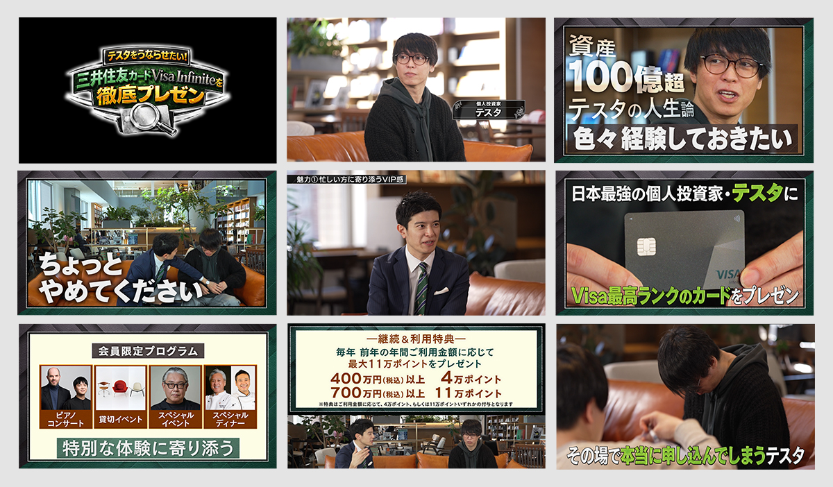マネーフォワードYouTubeチャンネルにて、投資家テスタ氏を起用したタイアップ動画を制作。第三者視点でVisa Infiniteの価値を解説することで、ミドルファネルにおける合理理解の促進を図りました。