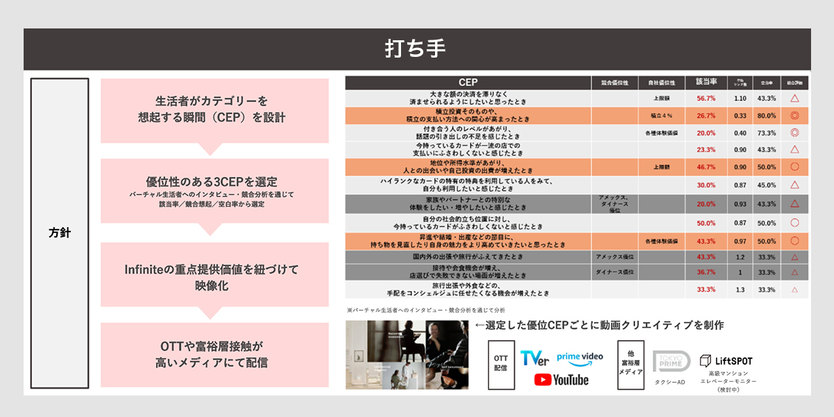 三井住友カード Visa Infiniteはローンチ以降、TVCMやYouTube配信により認知は一定水準まで到達した。一方で、その認知が獲得に十分結びついておらず、獲得アシストは限定的な状況であった。その要因として、提供価値は認知されているものの、生活者の具体的な利用シーンに結びついておらず、意思決定の文脈で十分に機能していないと考えた。