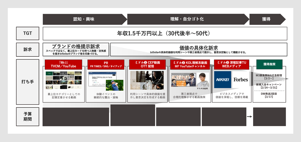 トップファネルでは、最上位カードとしてのブランドの格を提示し認知を形成。