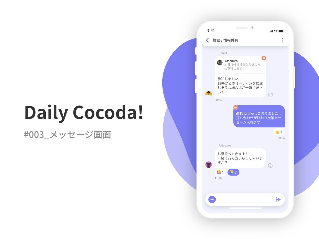 ・名前、アイコン、メッセージ、引用バッジ、スタンプボタン、スタンプ、送信時間と要素が多くなってしまったが、それぞれが一つのカタマリに見えるように組み方を意識した。