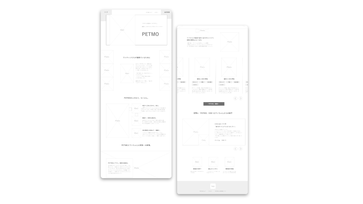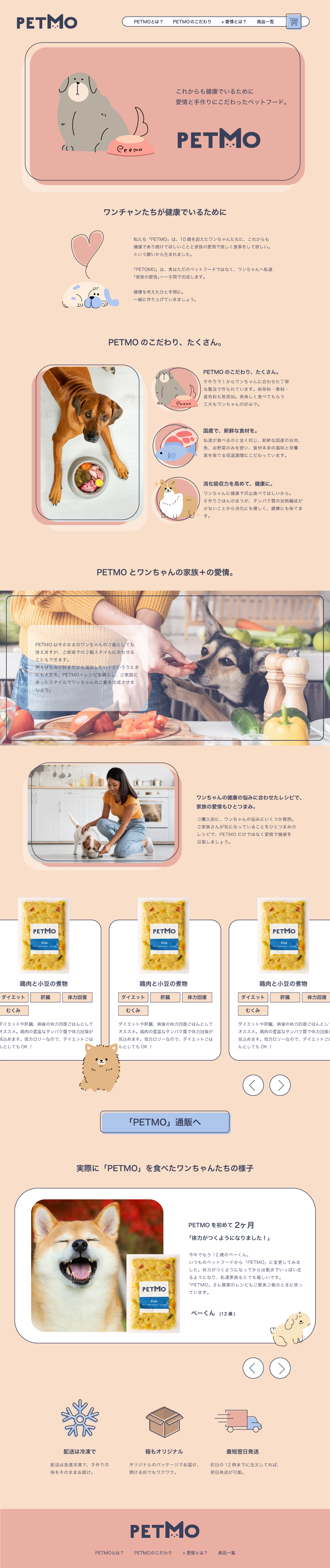 「ワンちゃんに寄り添う」をコンセプトにしたデザインで、あたたかみのある食事やワンちゃんの家族をイメージした配色やデザインを行いました。新商品の紹介で、まず知ってもらうことが重要だと思います。わかりやすい商品紹介を目指し、イラストなどを使用して製作しました。また、実際の声を活用することで、ユーザーがこの商品をより理解し、不安を取り除くことができると考え、取り入れました。