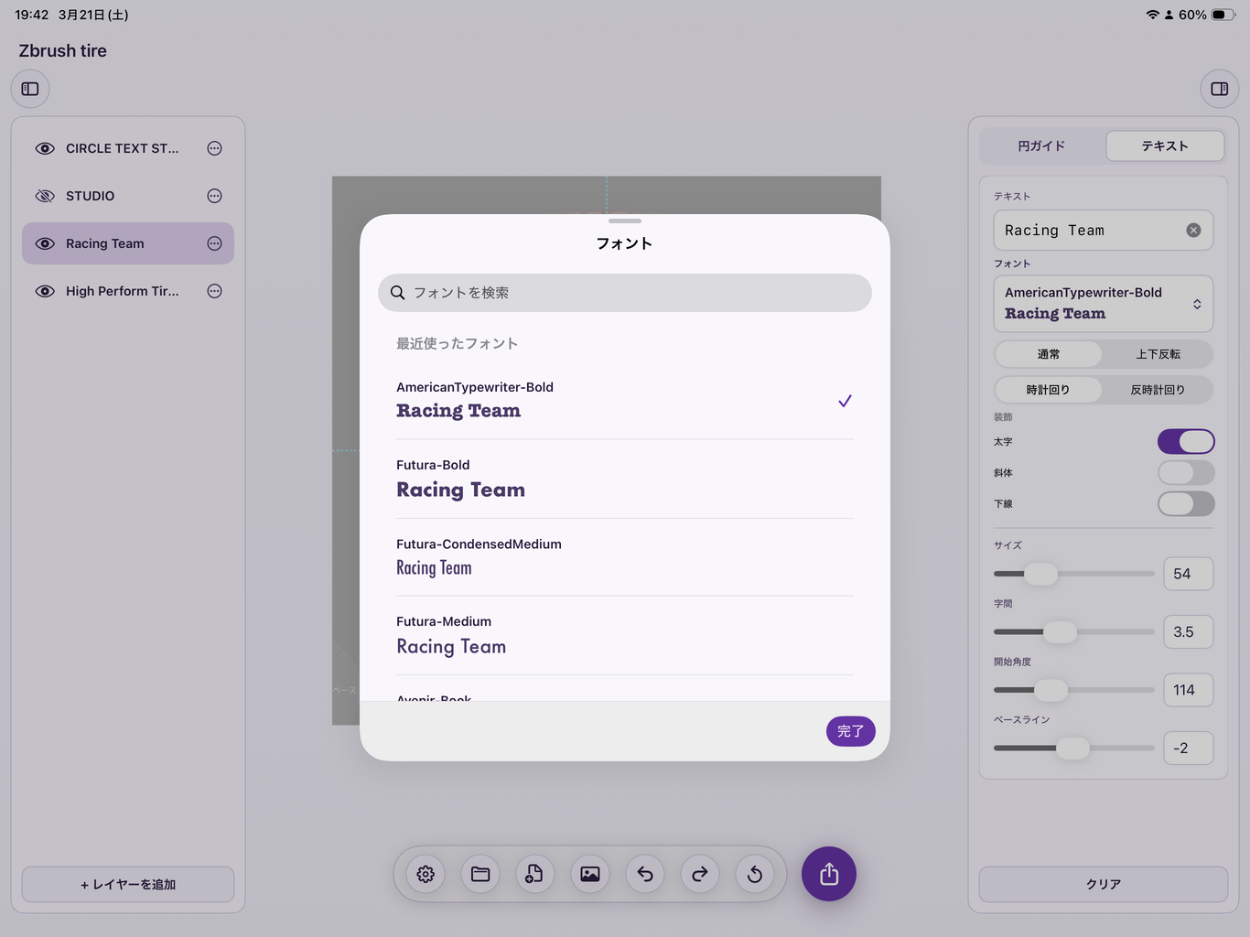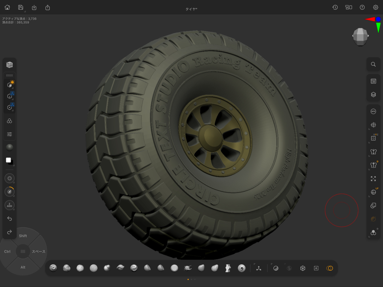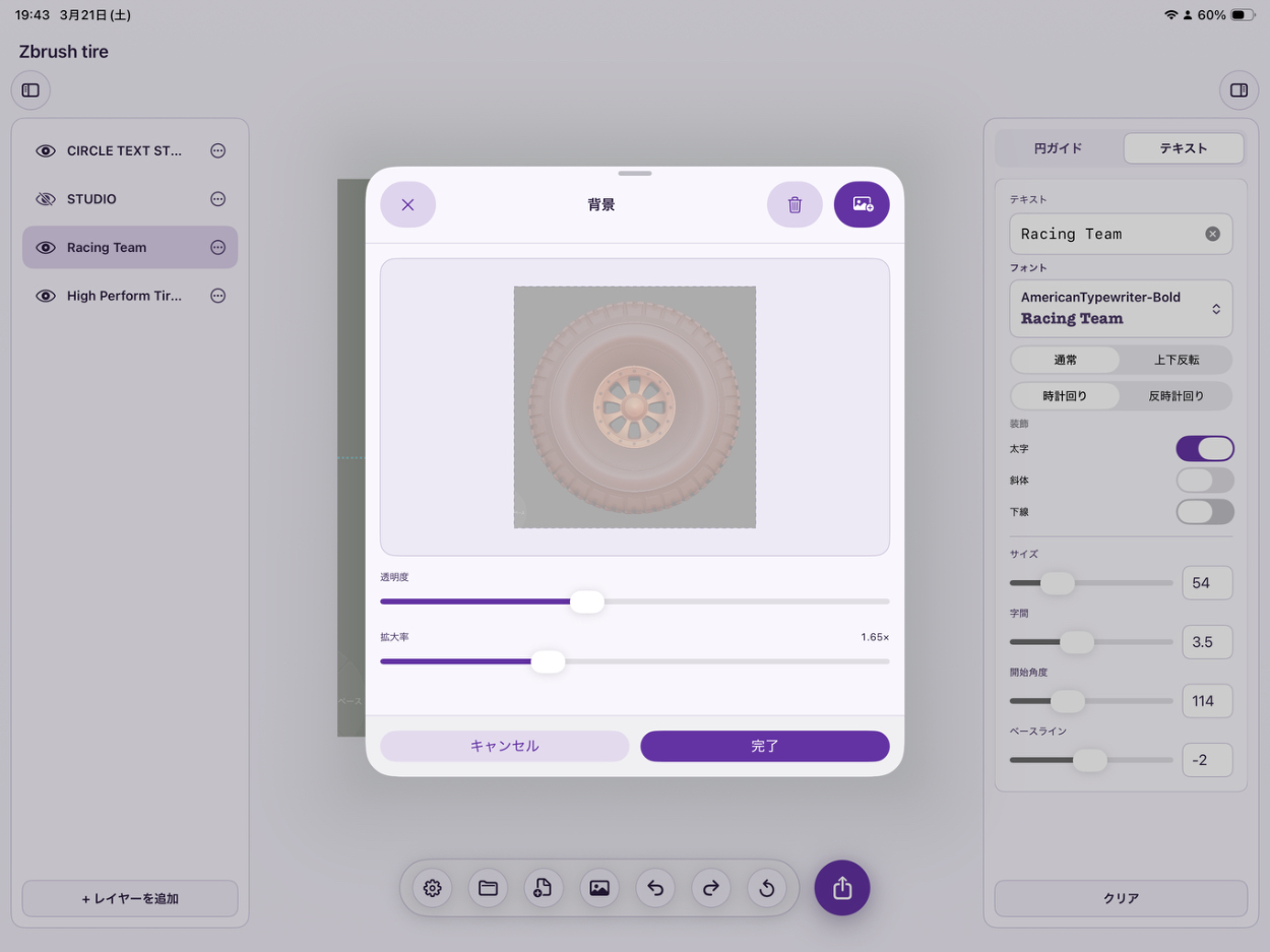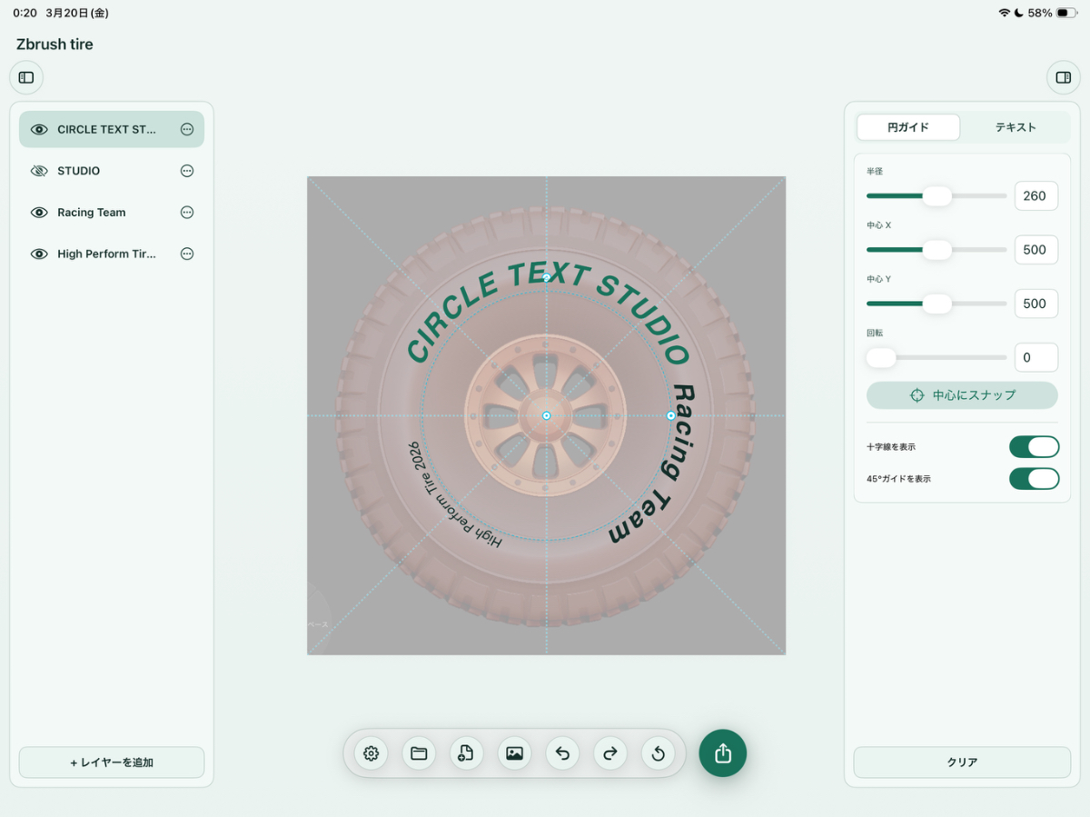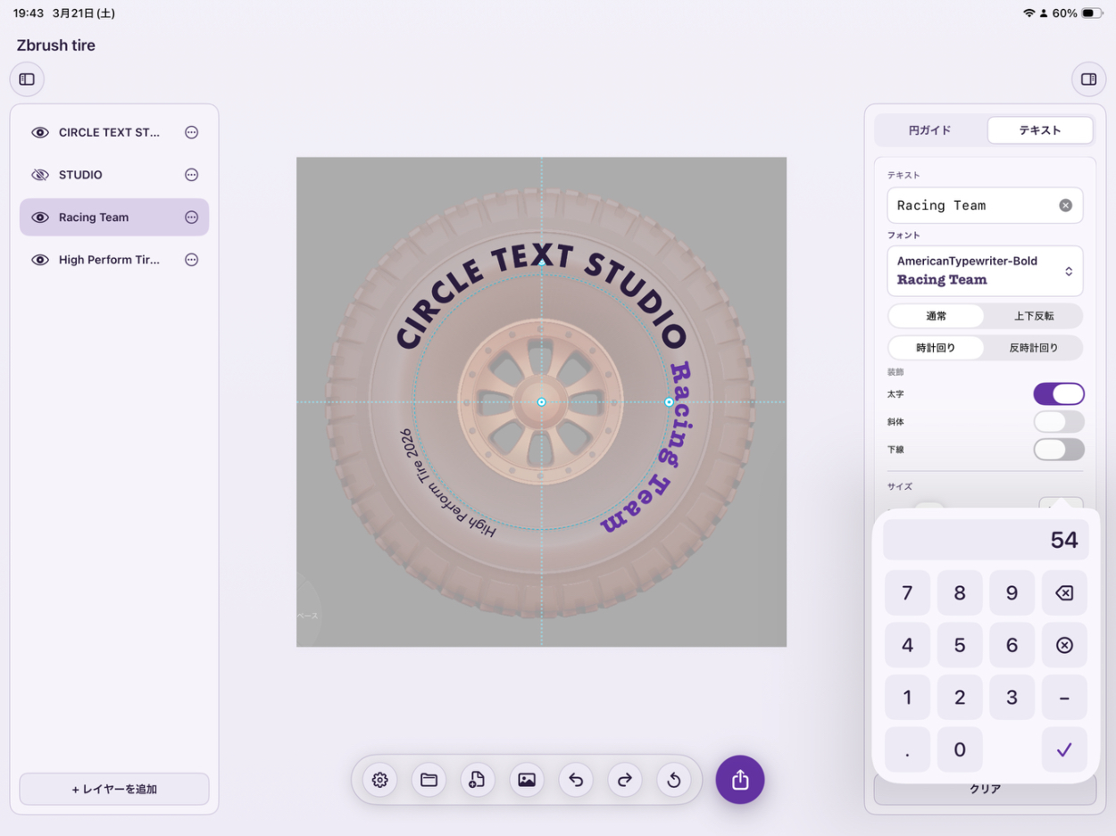 タイヤのモデリング記事を書いた際、ホイールのリムに沿って文字を配置したかったのですが、実現にはIllustratorかFigmaが必要であり、補助作業のためだけに高価で重いツールを立ち上げることへの違和感と、バイブコーディングでiPadアプリを実際に作ってみたいという動機が重なり、本プロジェクトを開始しました。