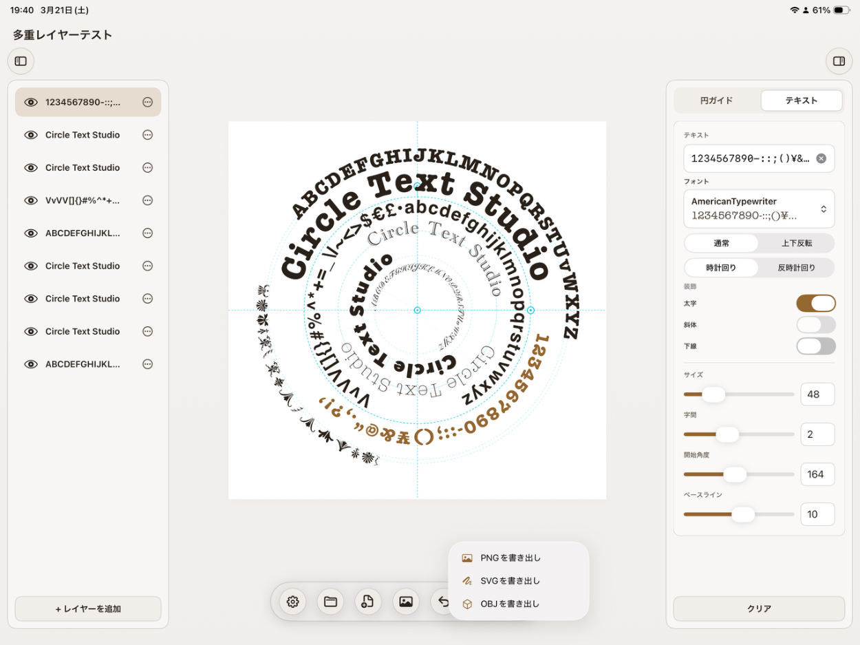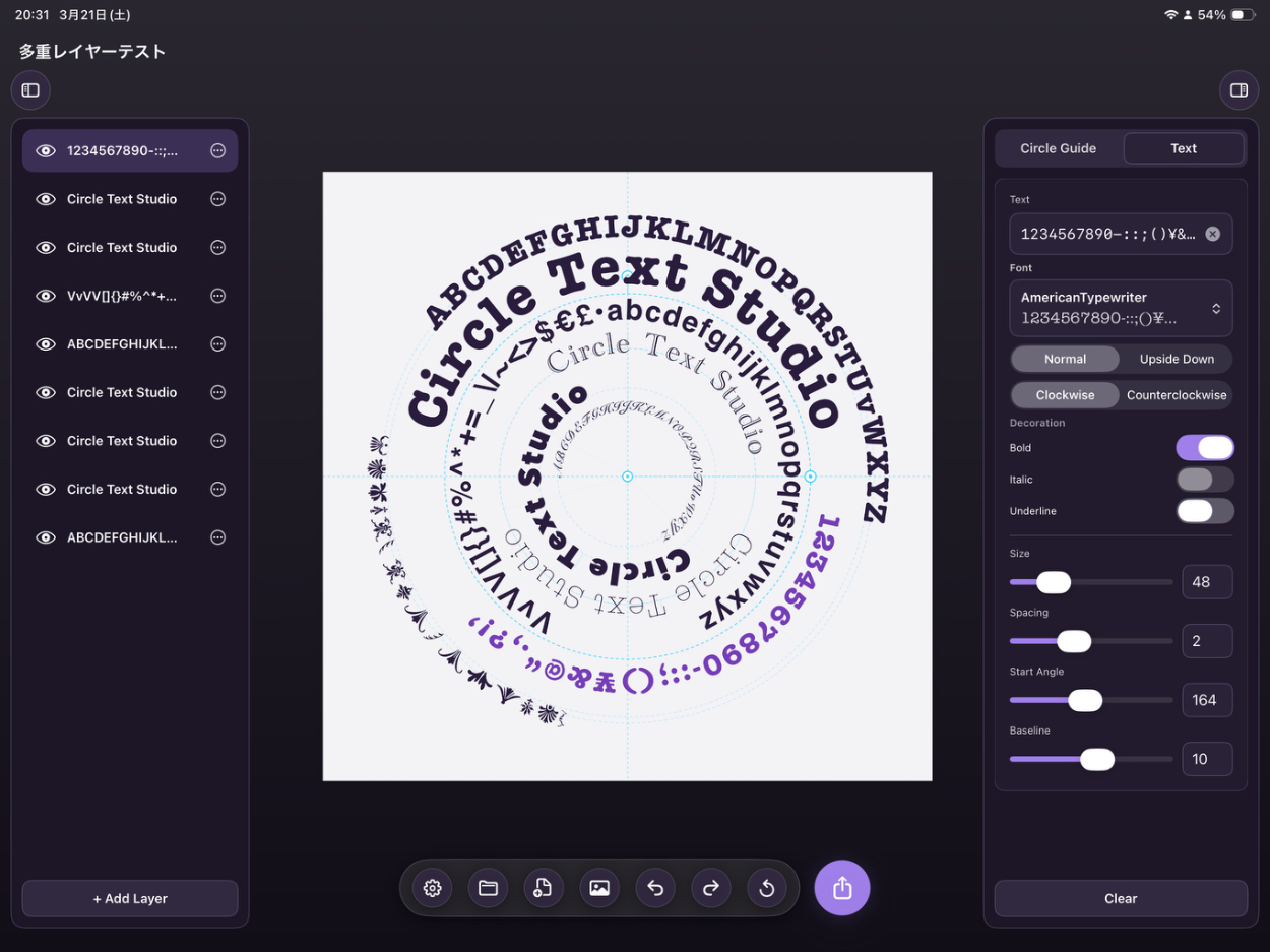 開発を通じて、円形テキスト配置という中核機能の実装後、レイヤー管理・保存・履歴・画像読み込みといった基盤機能の実装に想定以上の工数がかかることも実感しました。ユーザーが「使えるアプリ」と感じるためには、差別化機能よりも基盤機能の完成度が体験を左右するという理解が深まりました。