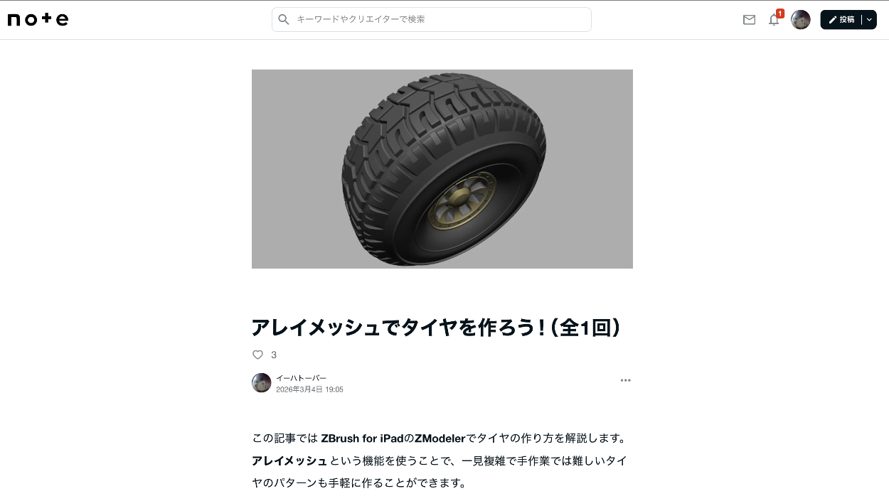 個人の趣味としてZBrushでのモデリングを続けており、制作過程をnoteに記事として公開しています。