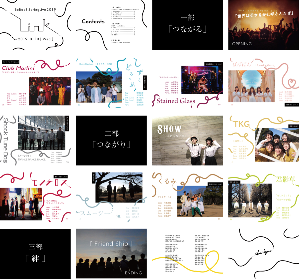 「Link」というライブテーマから、ロゴの線を延長させ ”つながり”を意識しました。中のバンド名は全て繋がっており、それぞれイメージカラーで多種多様な世界観を表現、一方、表紙はモノクロにすることでコントラストをつけています。