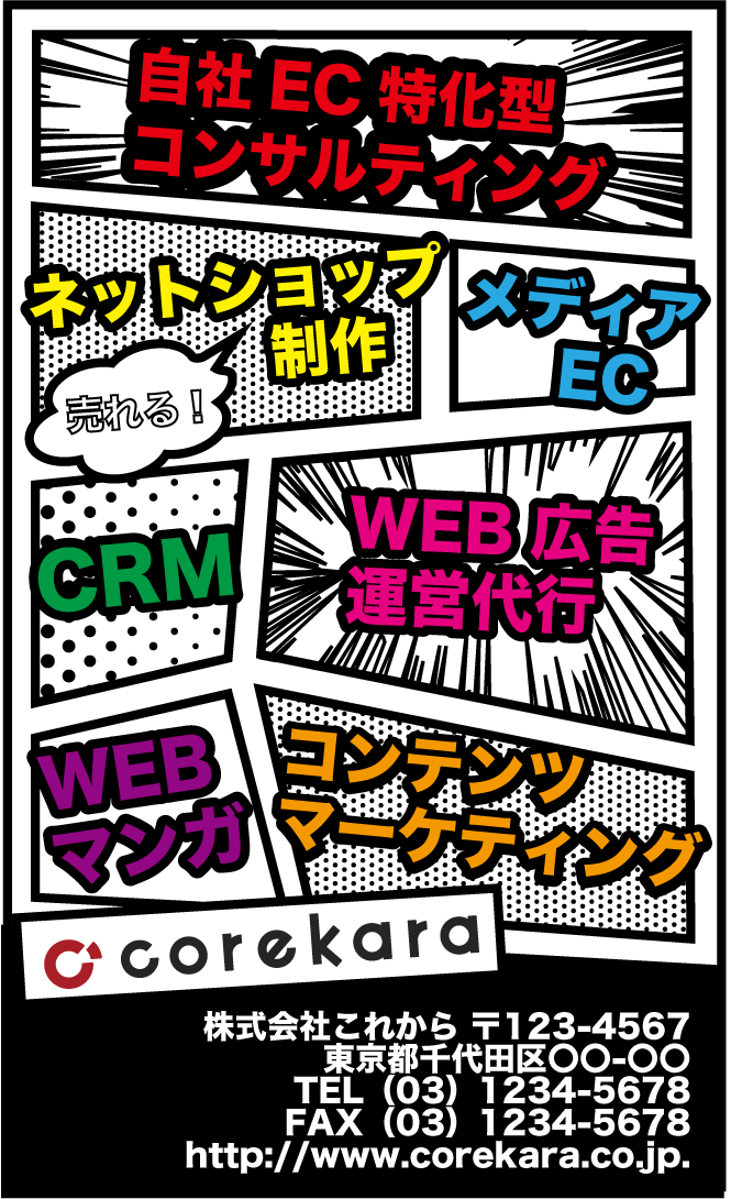 表はメンバーページのイラストを集中線の中に入れ、個人ページのリンクを吹き出しにし、裏は御社の強みを色分けしてレイアウトしました。CI(コーポレートアイデンティティ)を考えるとあまり多色使いは好ましくないと思いますが、”ぶっ飛んだ名刺”としてインパクトを重視しています。
