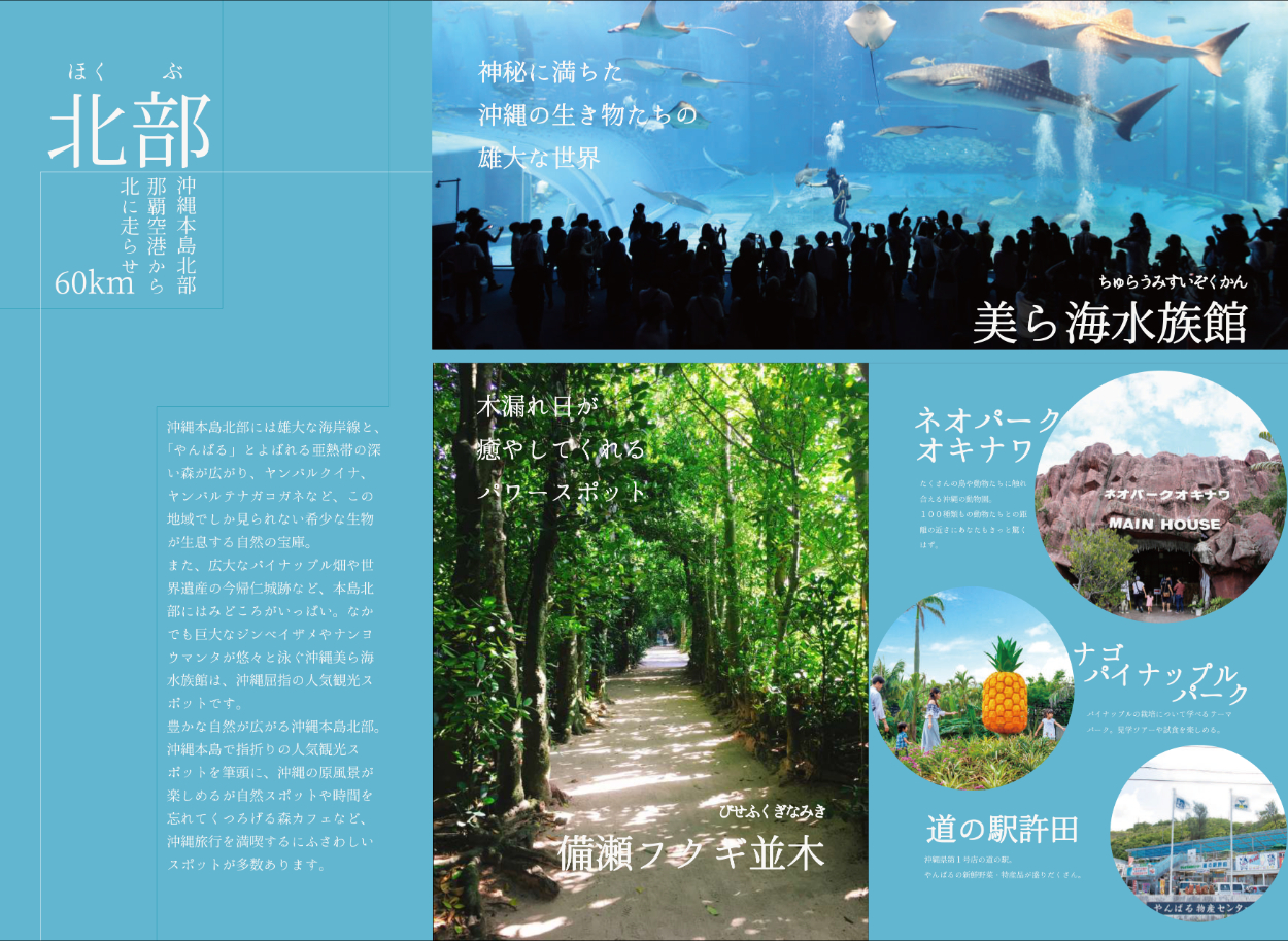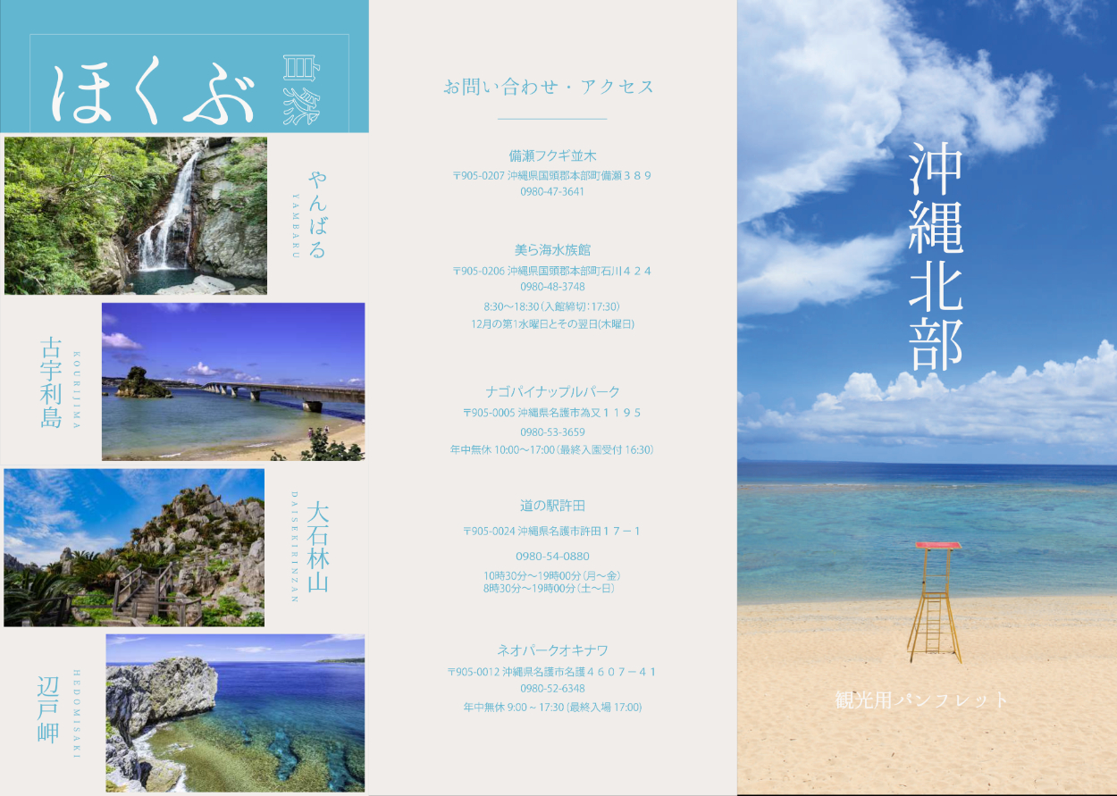 三つ折りパンフレット 末吉和仁 学生 私の地元沖縄のパンフレットを作ろうと思い、沖縄の中でも本島北部に注目して、観光客向けパンフレットを作成しました。10〜20代をターゲットに作りました。外面レイアウト内面レイアウト