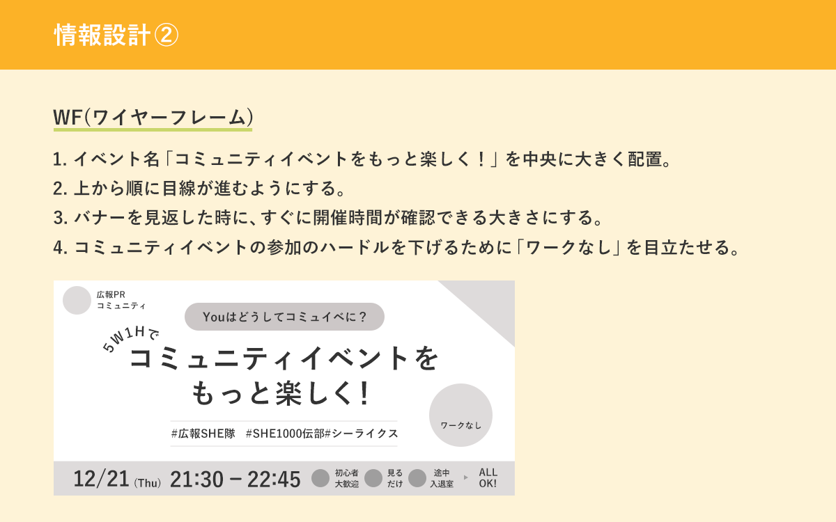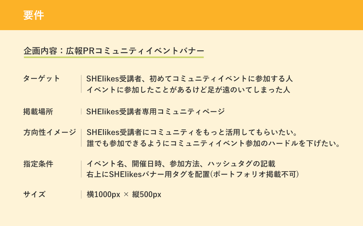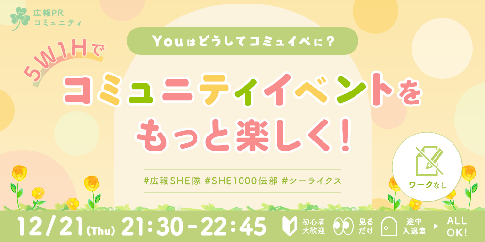 女性向けのキャリアスクール「SHElikes」内の「広報PRコミュニティ」イベントバナー。 制作時期:2023年12月 制作期間:3日間 使用ソフト:Photoshop