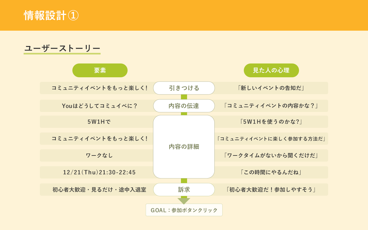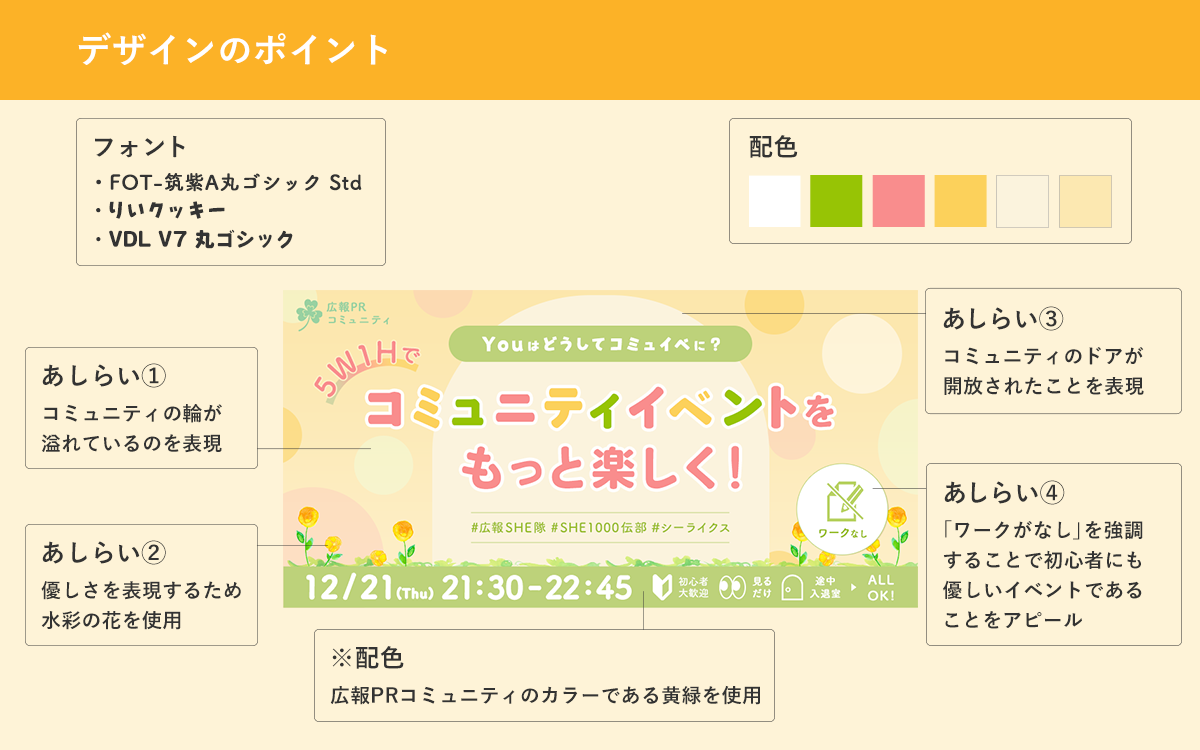 今回のターゲットは「初心者」「イベントから足が遠のいてしまった人」です。イベント参加へのハードルをできるだけ下げたいというメンバーの思いを汲み取り、ポップで可愛らしく、そして誰でも参加しやすいような優しい雰囲気にしました。