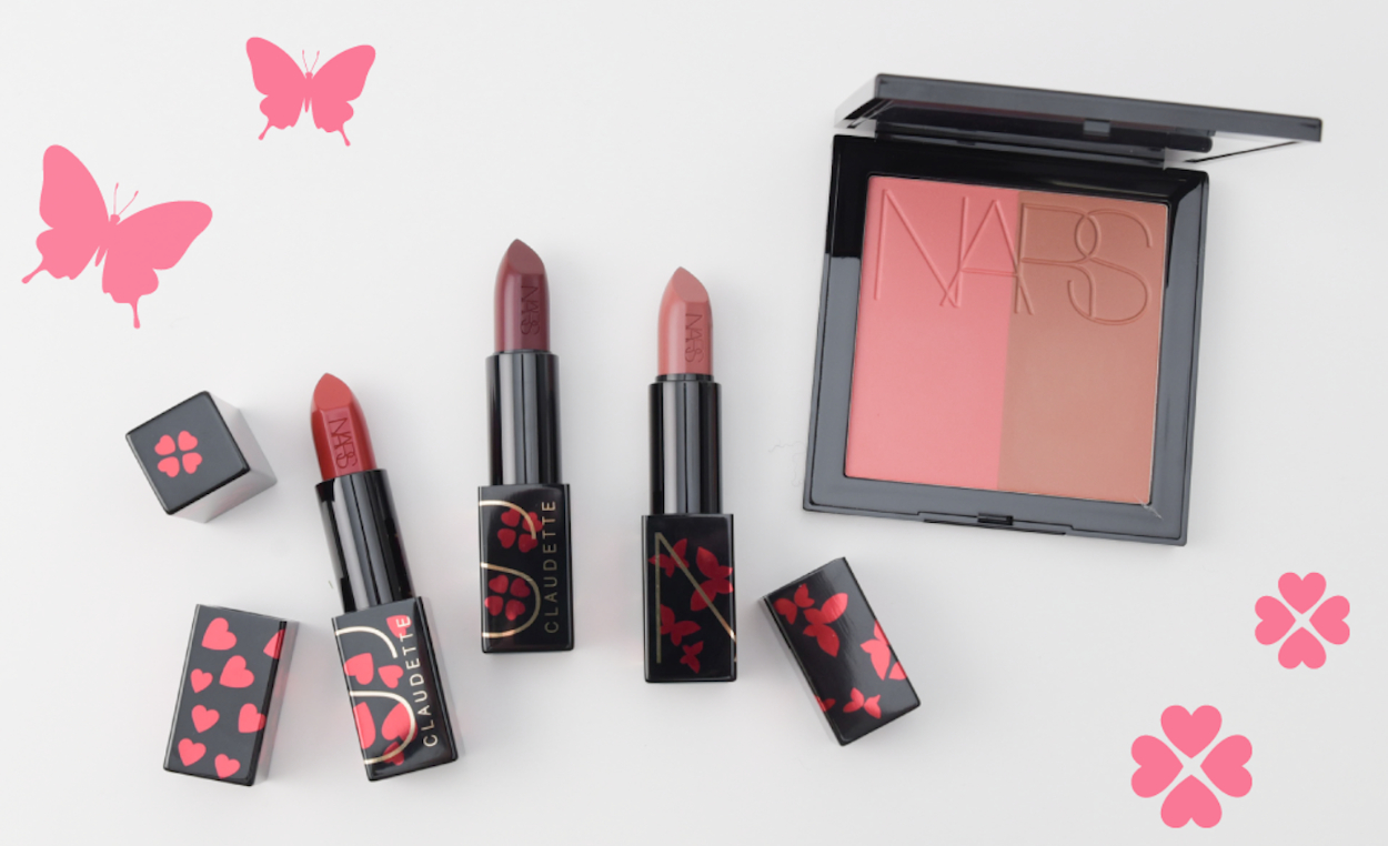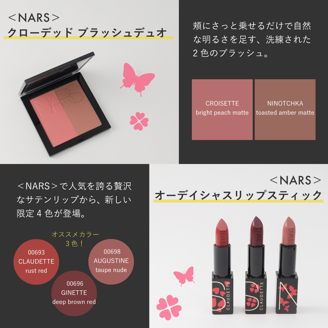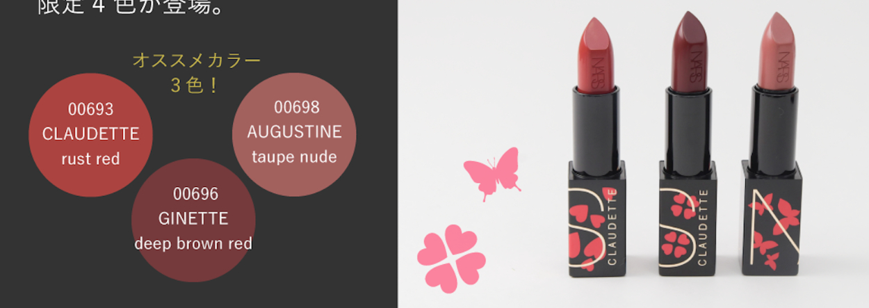 コスメ自体のカラーに合わせて、黒メイン・ピンクと黄色をアクセントに設定しています。あしらいも商品パッケージにあしらわれている特徴的な蝶々やクローバーと近しいものを採用しています。