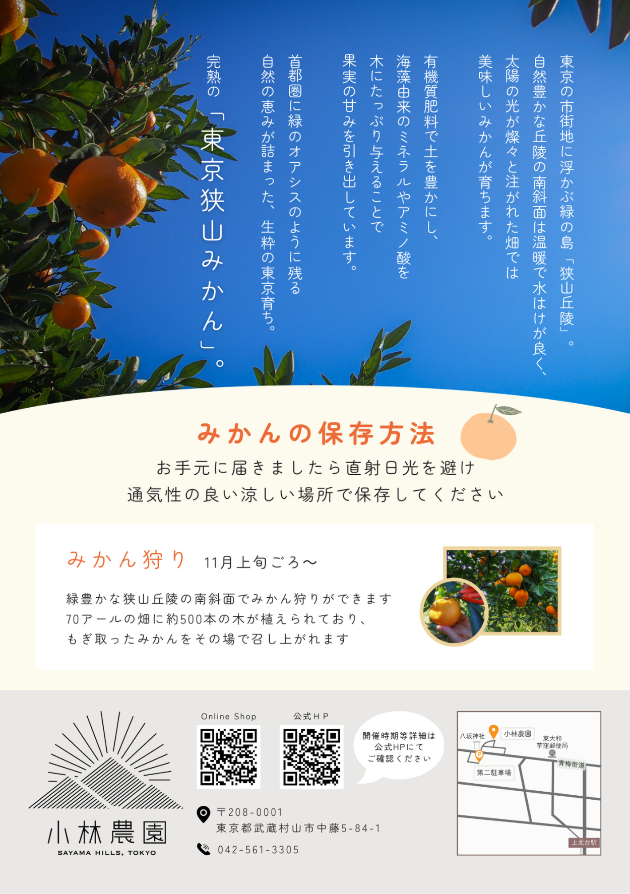 東京狭山みかんの特徴やこだわり・みかんの保存方法・農園の情報を知ってもらうためのパンフレットで、みかんを送ってもらった人が農園に興味を持ち、今度は自分で注文してみようかな、みかん狩りに行ってみようかな、と思わせること。
