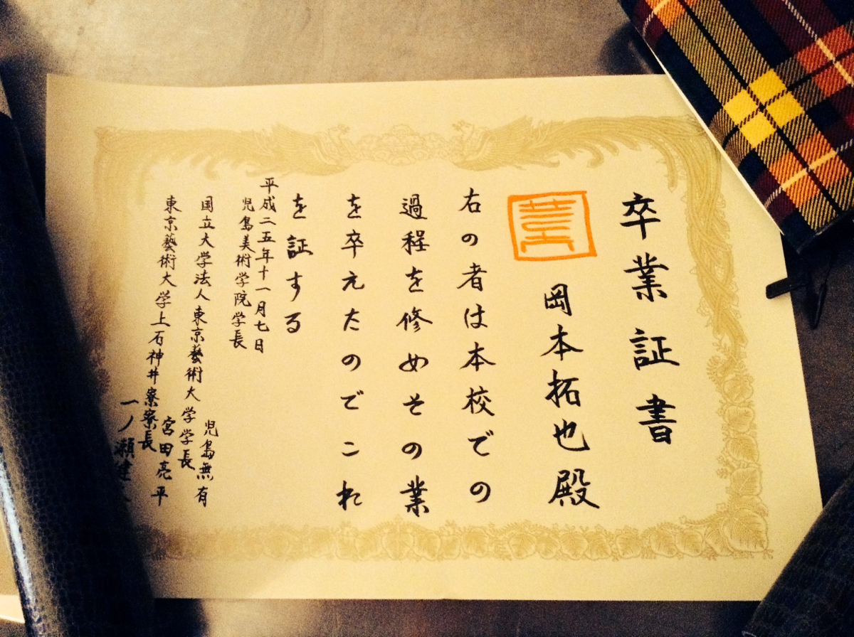 送別会にて頂いた藝大の卒業証書 (っぽいもの)です。