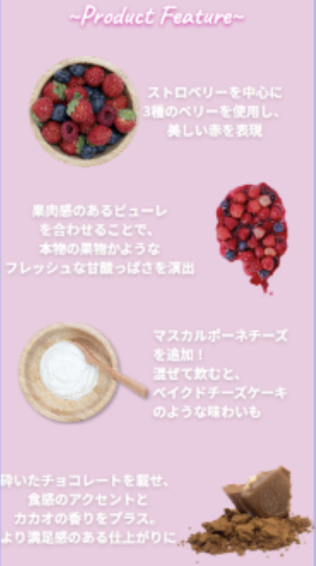 新作フラッペのキャンペーンLP Tsujimoto Minori Webデザイナー OVERVIEW HerTechの講義で制作しました。 YEAR 2024 スマホ用のLPです。新規顧客のCVをあげるのが目的。女性らしさもあるベリーの赤やピンクで飾りました。 WEBSITE