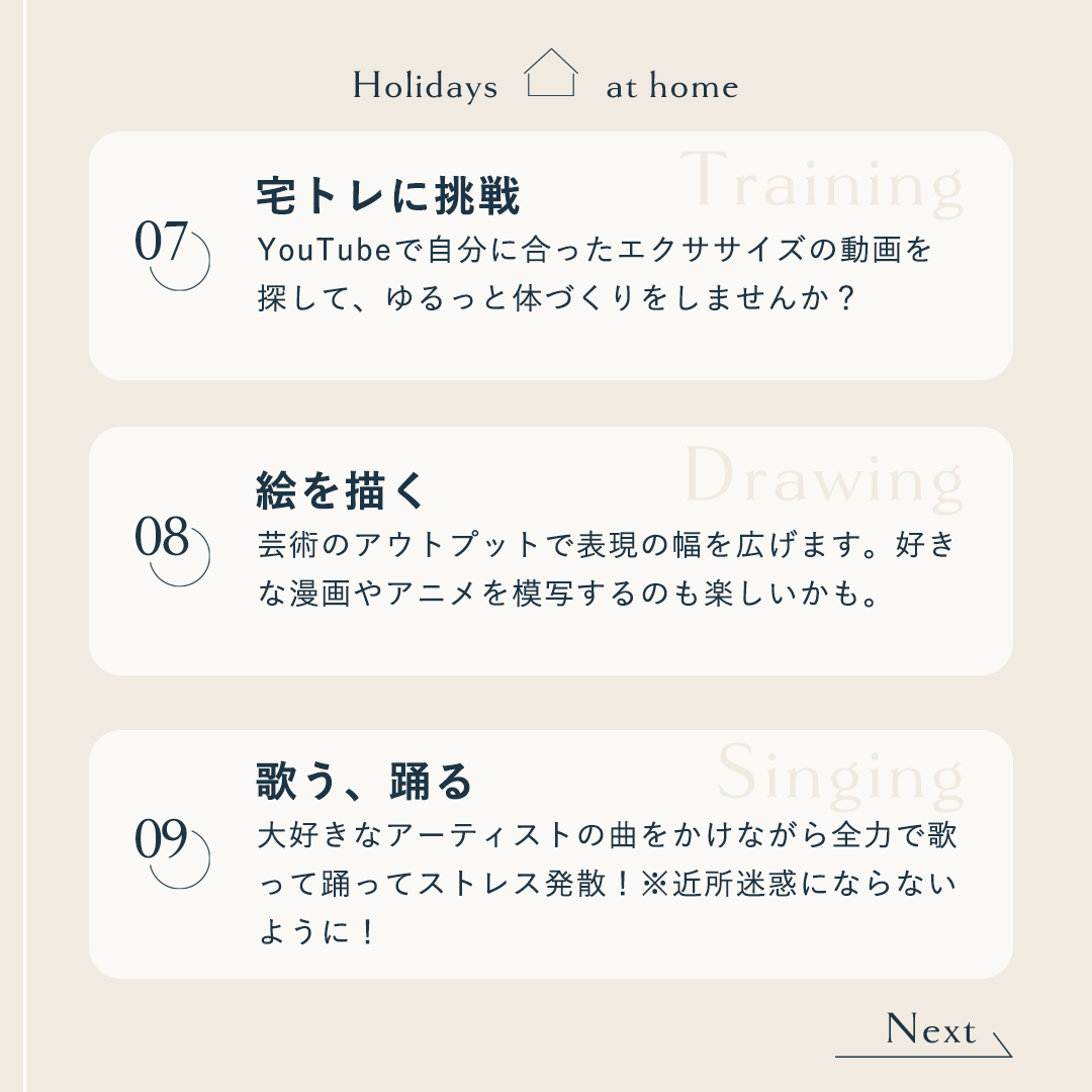 内容及び構成の検討は実体験をもとに12個のTipsをリストアップしたので、説明文も考えやすかったです。「休日」なのでなるべく取り組むハードルが低くなるような項目をピックアップし、且つSHElikesへの興味へも繋げられるよう意識しました。