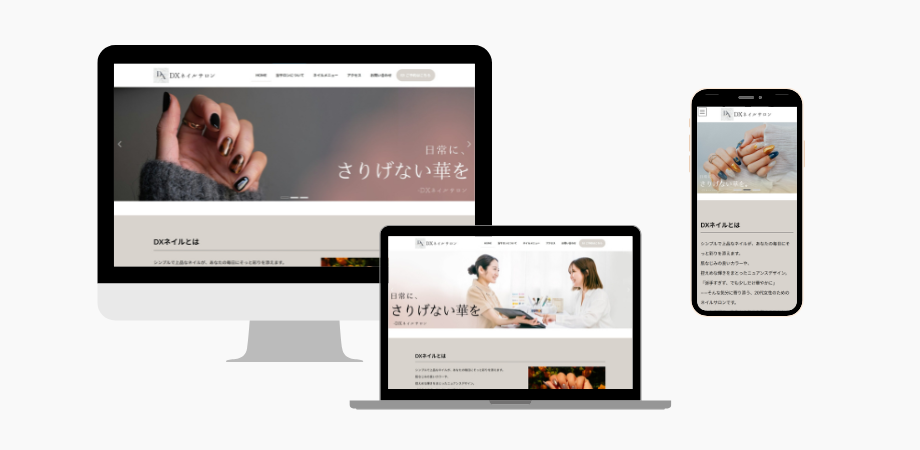 またヘッダーメニューも訪問ユーザーに必要なコンテンツ(「ネイルメニュー」「アクセス」「ご予約はこちら」など)を揃えています。