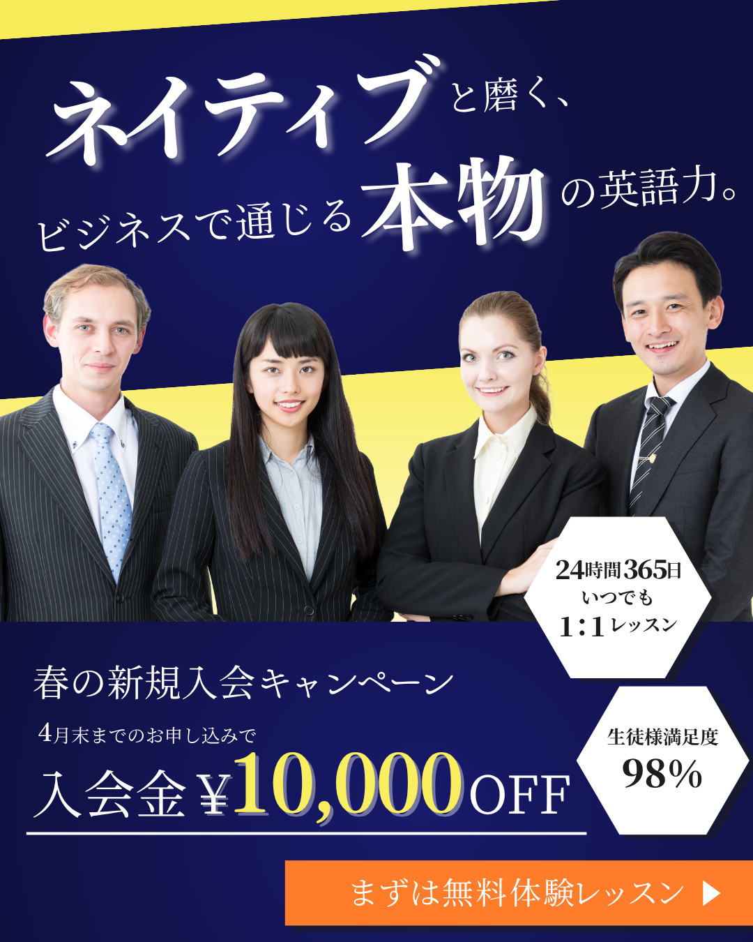 外資系企業に勤務されている30代後半〜40代の男性。 英語でのミーティングや商談にもっと自信を持ちたいと考えている。 仕事が忙しいため、いつで好きな時間に受講できるようなスクールを探している。