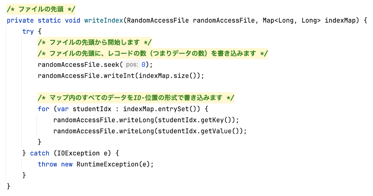 Mainクラスには、writeIndex()メソッドがあります。このメソッドは、.datファイル内のIDのインデックスをMapに読み込んで、その後ファイル内でそれらを検索できるようにします。