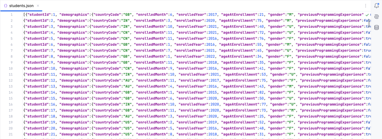 JSONファイルには、1000件のレコードが含まれており、それぞれが以下のようなデータを持っています:
