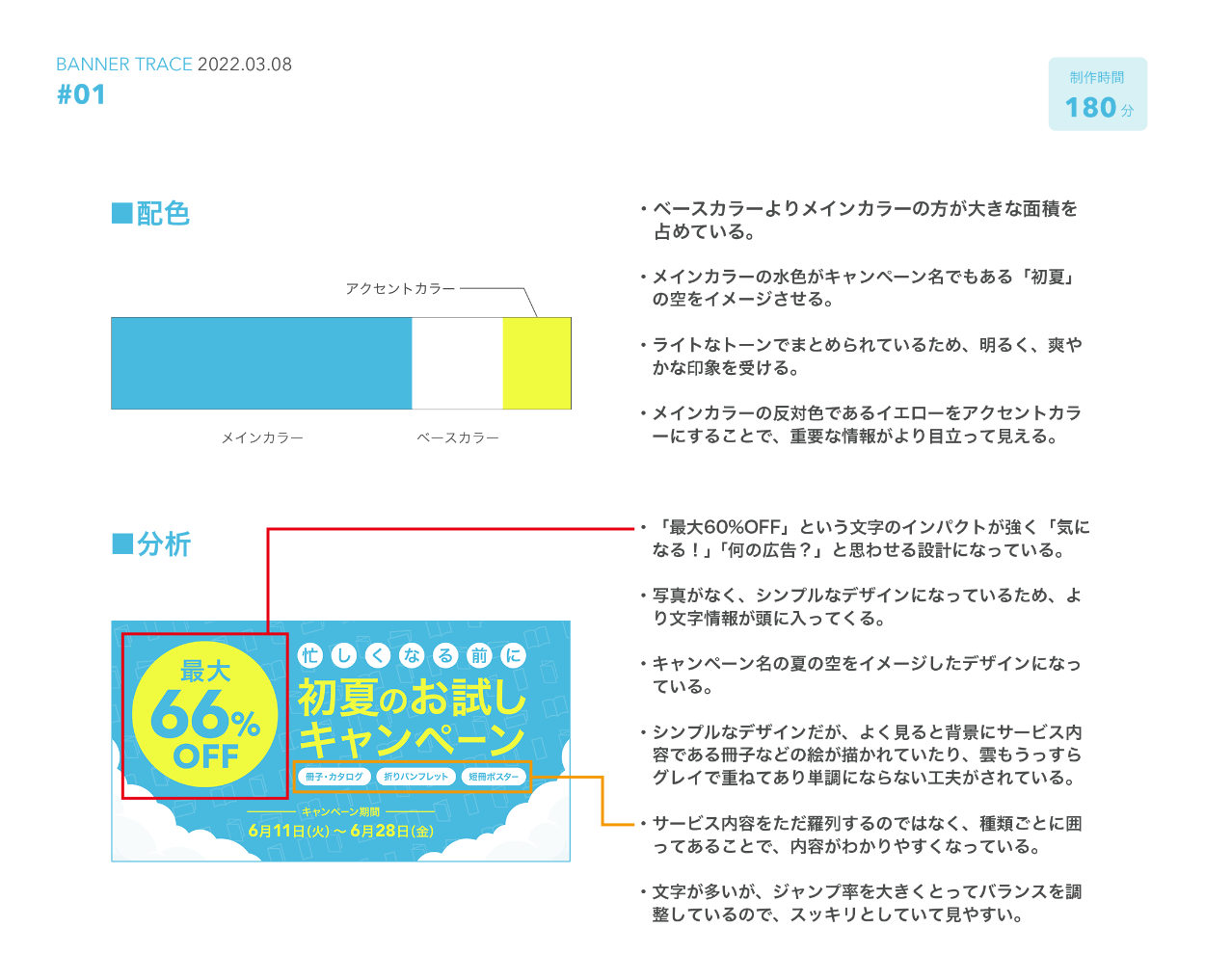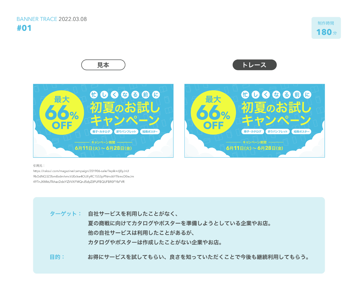 SHElikesマルチクリエイターコースの課題で、バナートレースに取り組みました。 バナーのターゲット・目的・配色・観察と分析の結果をまとめました。 ◇使用ツール:Illustrator