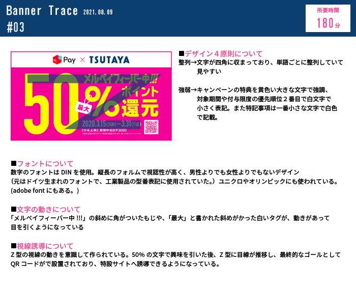 分析の際には、このバナーを見る人の視線の動きを意識しました。左上→右上→左下→右下の順番に「Z型」に視線が動くように設計されていることに気づき、このバナーの制作目的とゴールについて考察しました。
