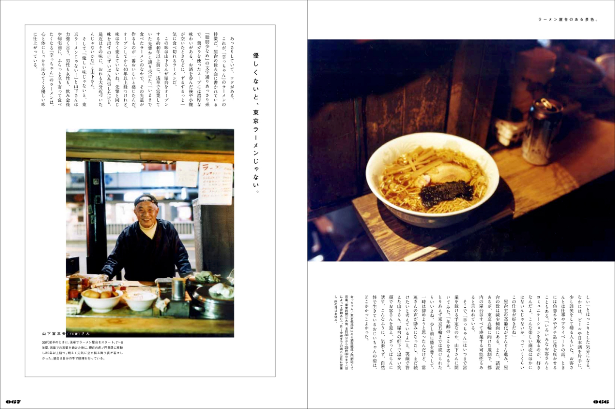 この味は山下さんが屋台をオープンする約40年以上前に、浅草で営業していた先輩から譲り受けた。「いままで食べたラーメンのなかで、その先輩が作るものが一番おいしいと感じたんだ。オープンしてから40年以上経つけど、味は全く変えていないね。先輩と同じ味を出すのにずいぶん苦労したけど、最近はその求めていた味に、おれも大分近づいたんじゃないかな」と山下さん。