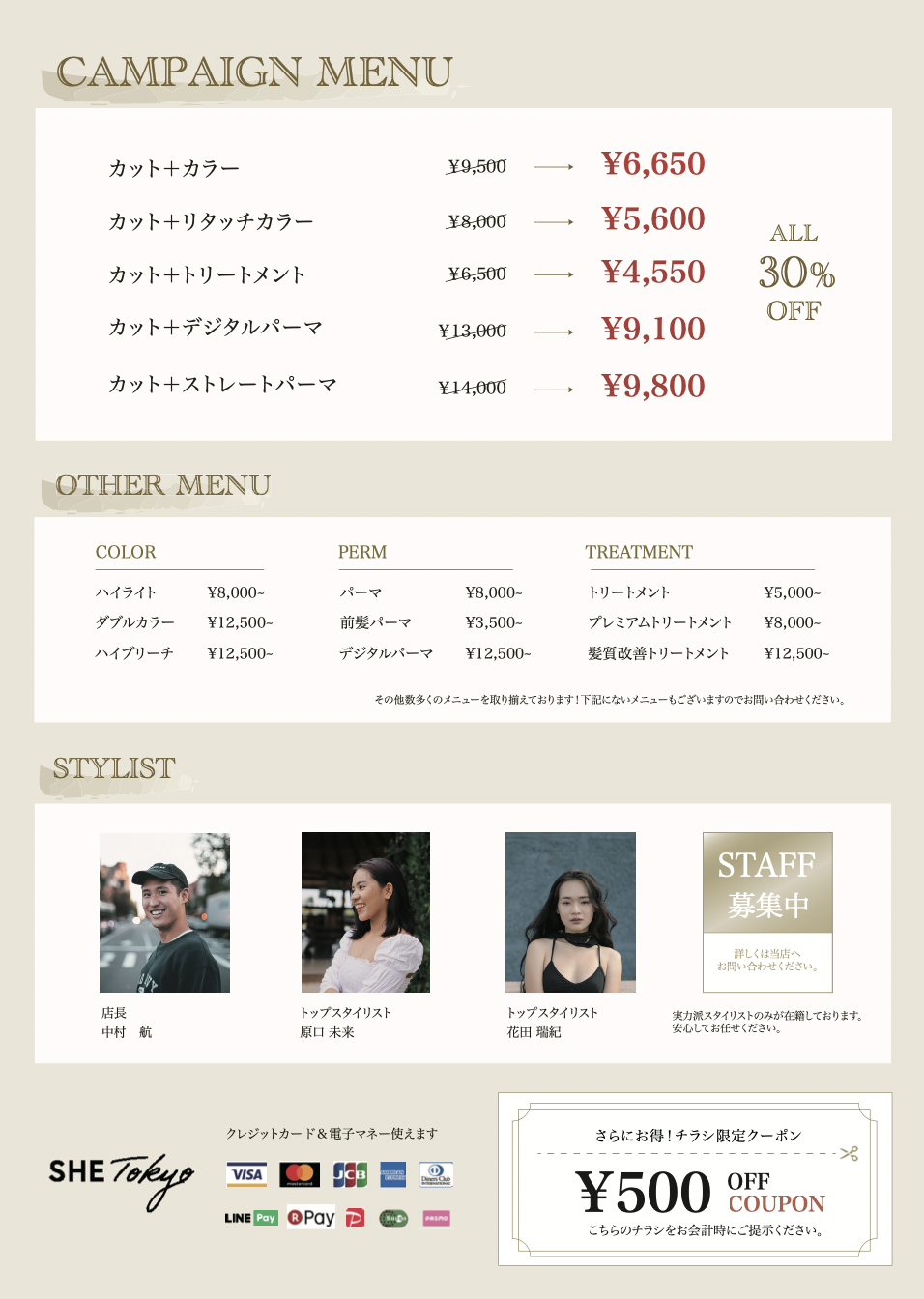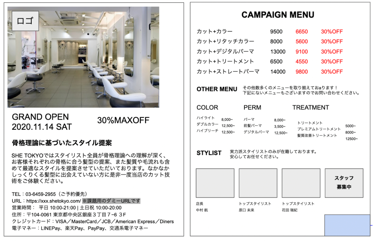 少し高めの料金設定でも、似合うよう仕上げてくれるスタイリストにお願いしたいヘアスタイルにこだわりがある人をターゲットとしているのでファッション感度の高い自立した女性をイメージしました。