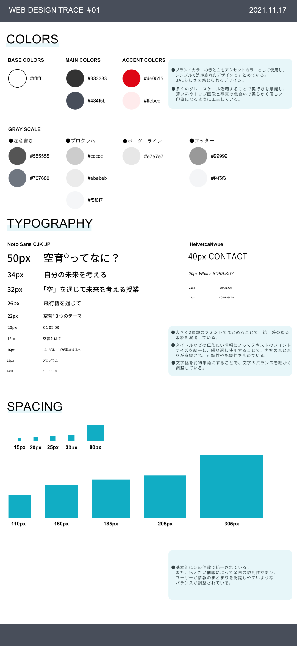 SHElikes MULTI CREATOR COURSEの課題で、LPトレースに取り組みました。LPをトレース、デザインガイドラインの制作、PCとスマホのデザインを比較・分析してまとめました。(制作日:2021年11月、制作時間:25時間、使用ソフト:Photoshop)