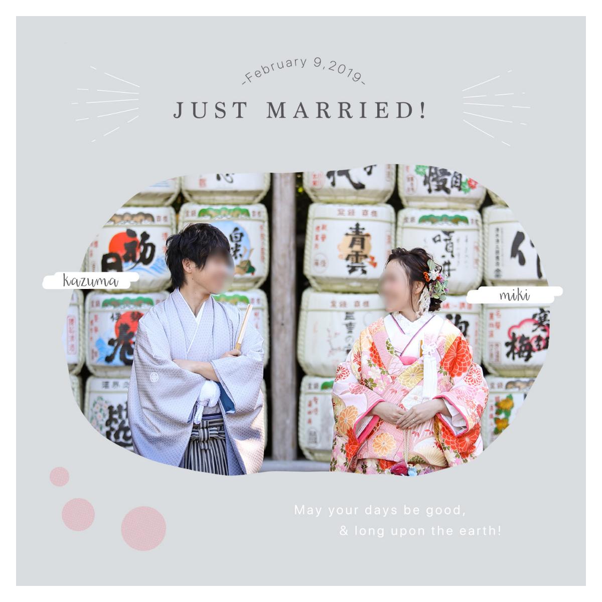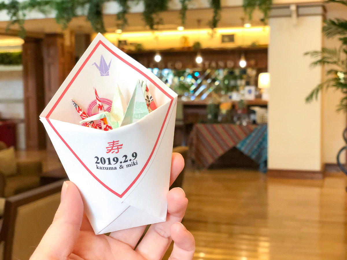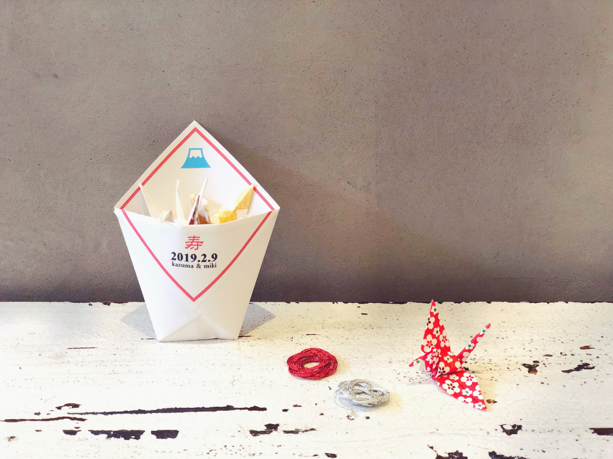 富士山や折り鶴など、異なる和柄のアイコンイラストで全8パターン作りました。デザインは花嫁が具体的に理想を伝えてくれたので、1回の修正を含めて1時間ほどで完成。実は中身が空っぽになるとメッセージが見える仕組み。イラストを変えればフラワーシャワーにも使えそうです。
