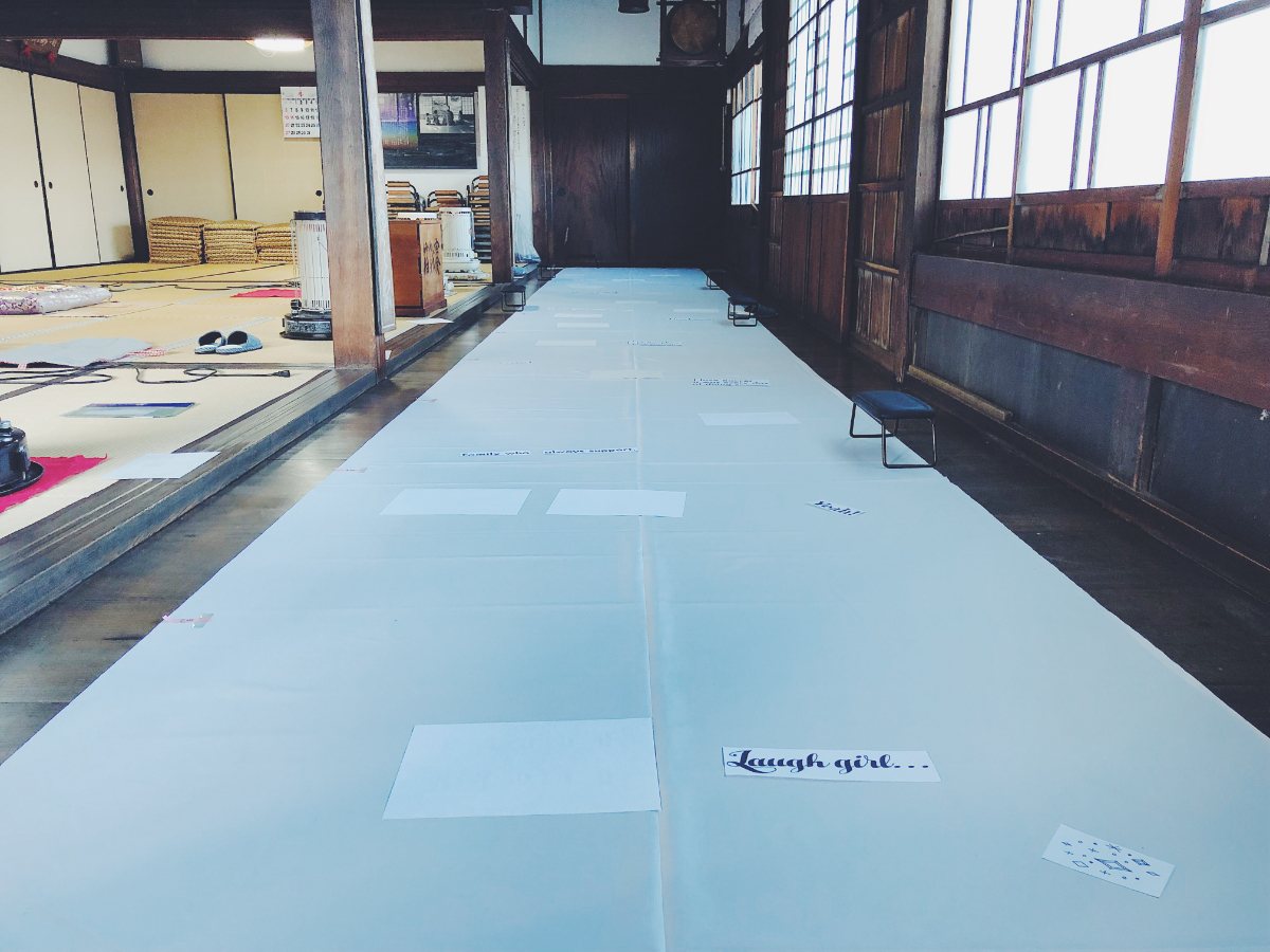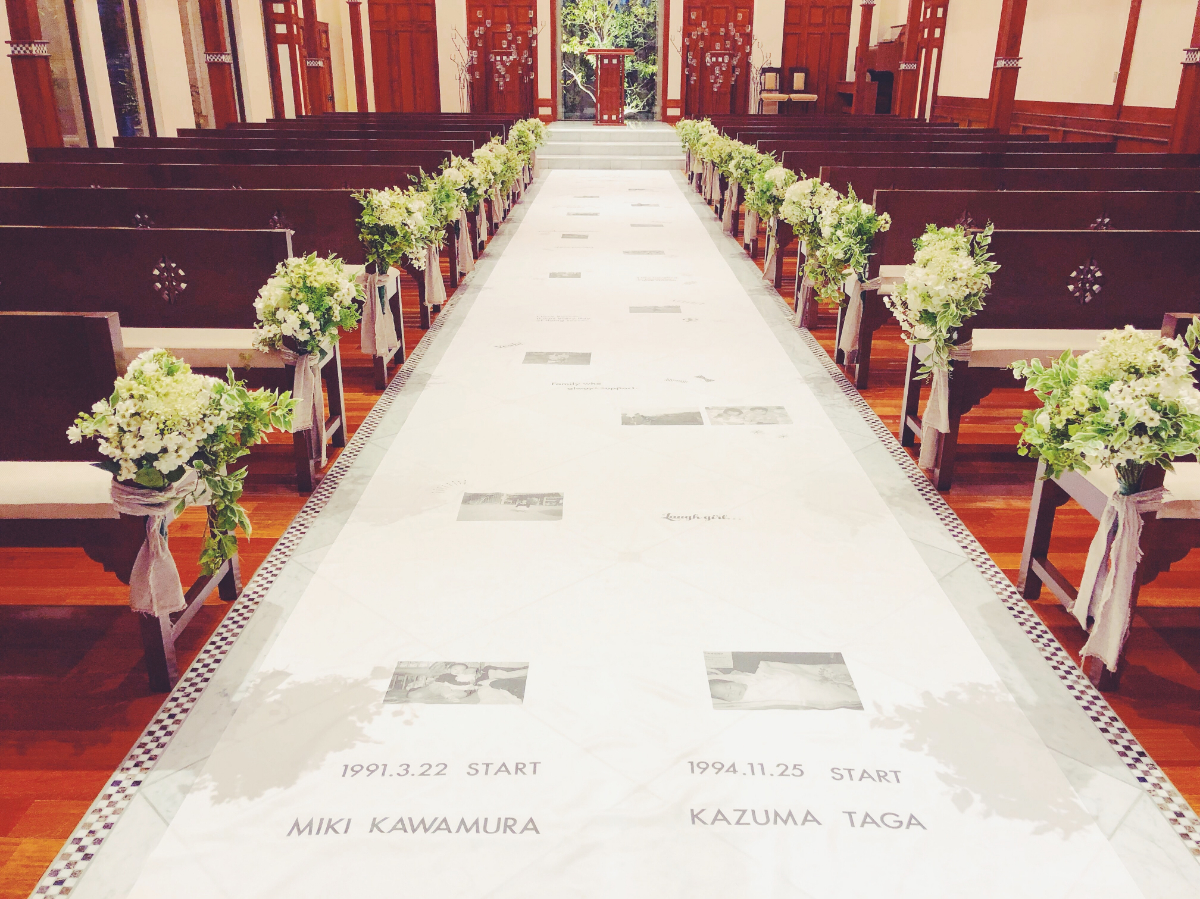 海外挙式に憧れる花嫁の希望でフルオーダー制作。縦13m、横1.5mの布に転写シートに印刷した写真や文字などを貼り付けました。ラフは花嫁が書き、1時間ほどでデザインを制作。画像を反転して転写シートに印刷し、アイロンで貼り付ける作業に4時間ほど要しました(アイロン2台、作業員数4名)。挙式の前日にも約2時間かけてチャペルでアイロンがけしました。