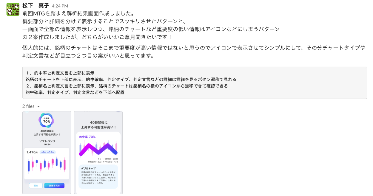 また議論を建設的に進めるために、それぞれの案のデザインの意図、デザイナー側として一番のおすすめを結論として出します。自身がファシリテーターになるのを意識しながらコミュニケーションを行うようにしていました。