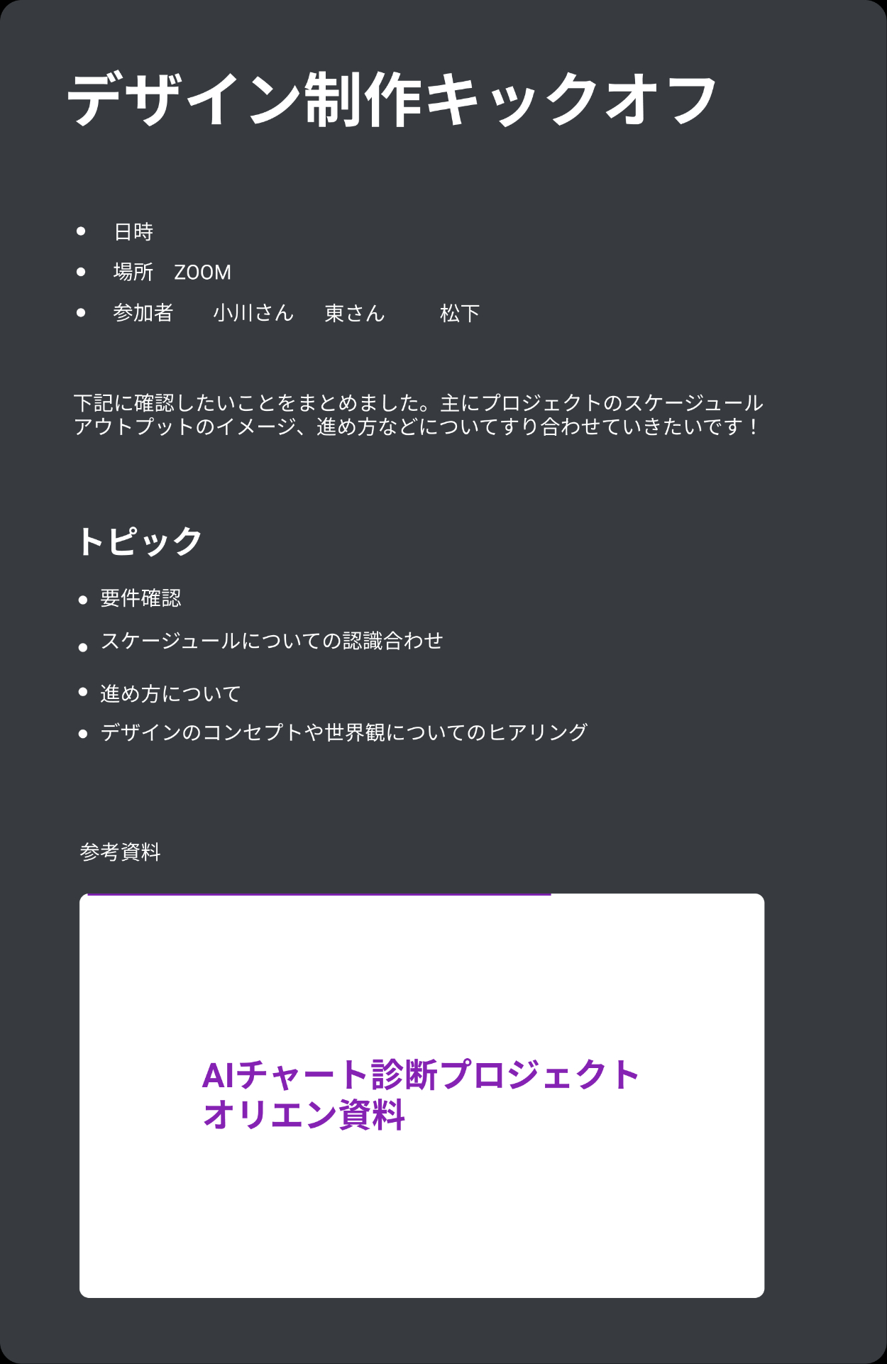 初回のキックオフミーティングは下記のような内容で実施し、プロジェクト初期から「どのようなステップで」「何を」「どのように作っていくのか」への認識を明確に揃えることで、確度の高いアウトプットを出していけるよう意識しました。