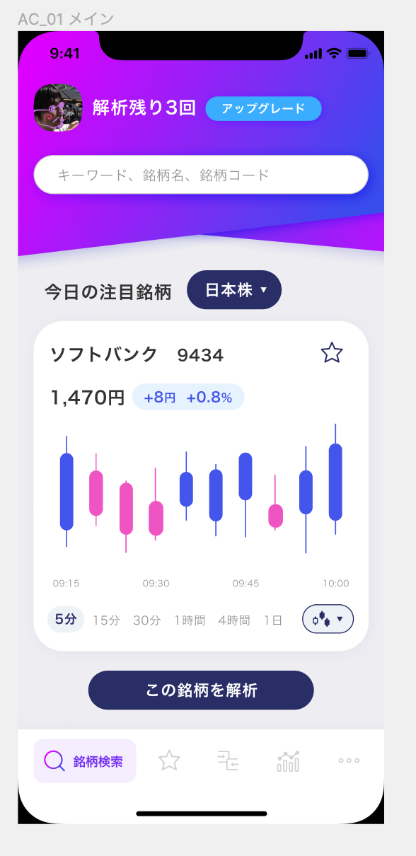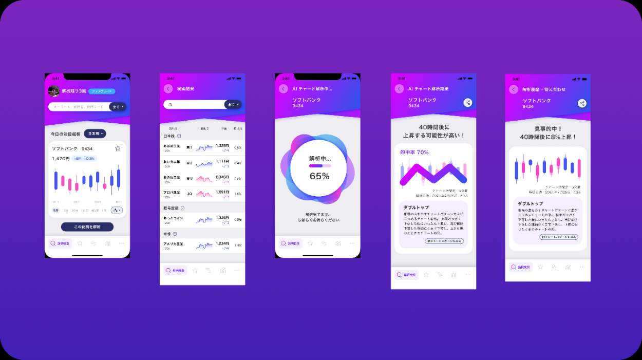 トレライザーは、人工知能を活用して株価の予測を行うアプリです。銘柄の株価が上がるか下がるかを予測し、さらにどれくらい当たるかの確率をパーセンテージで表示します。今回のプロジェクトではざっくりとしたアイデアや体験設計が固まった段階で参加し、アイデアをワイヤー落とし込む部分とUIデザインを担当しました。