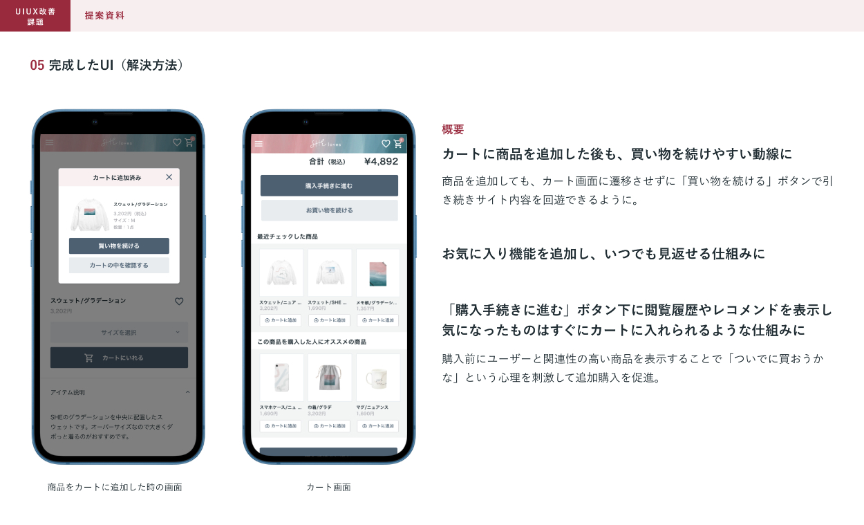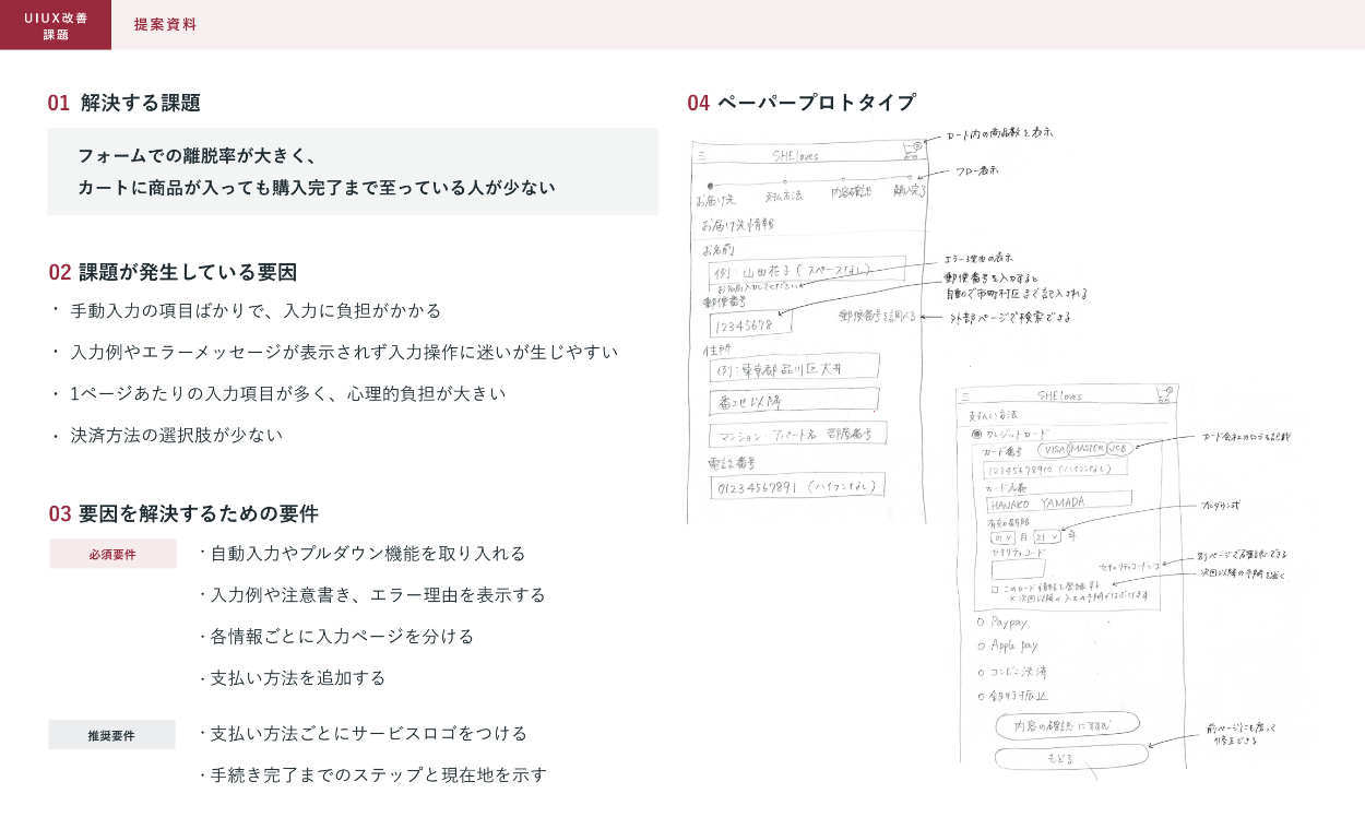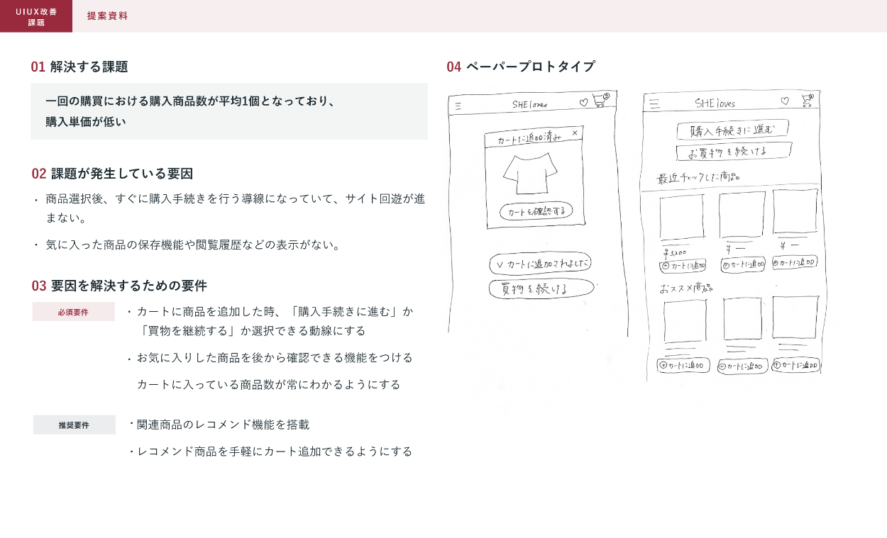 ECサイトの売り上げを伸ばすためにUIUX改善に取り組み、解決案を提案資料として作成してほしい。(3つある課題の中から2つ選び、改善提案を行う)