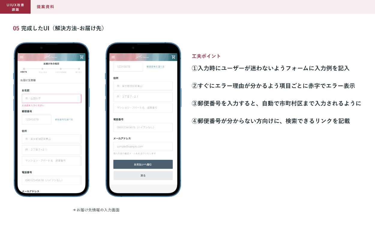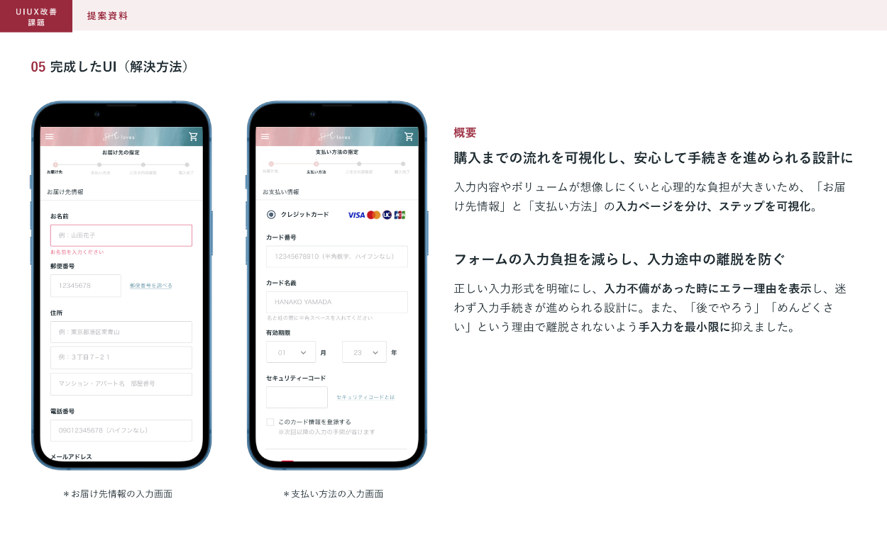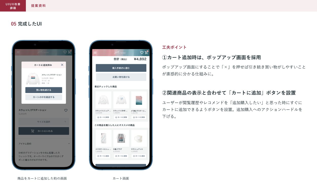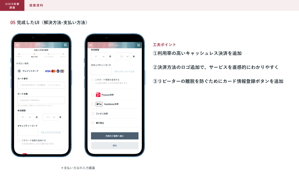 ECサイトの売り上げを伸ばすためにUIUX改善に取り組み、解決案を提案資料として作成してほしい。(3つある課題の中から2つ選び、改善提案を行う)