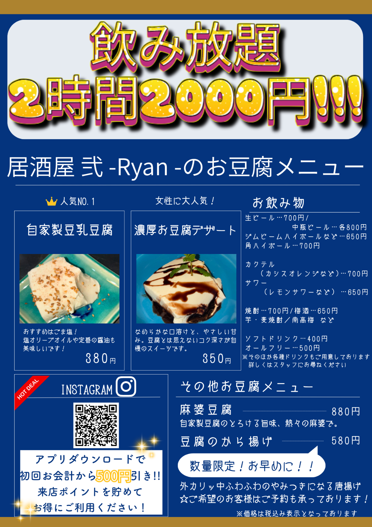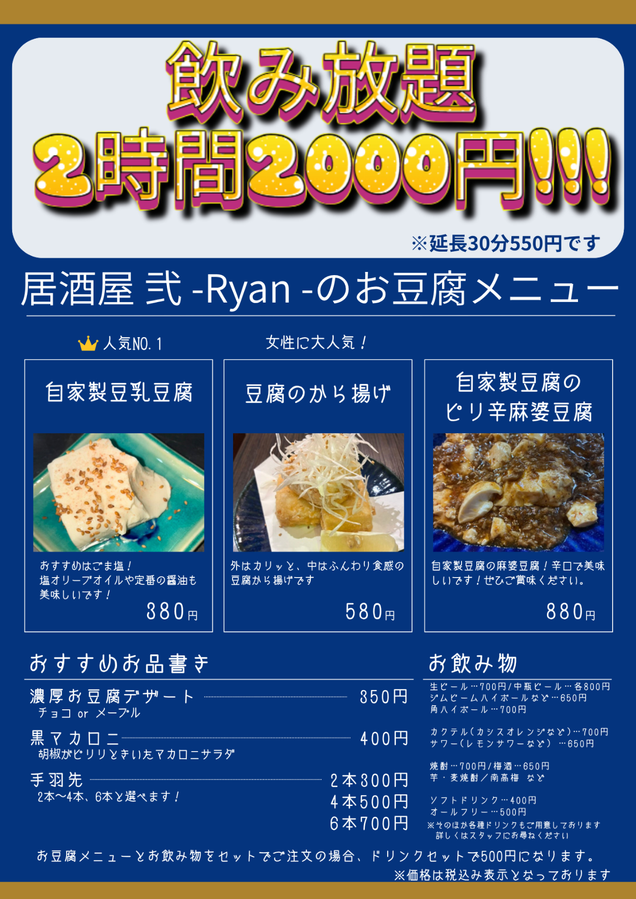 居酒屋 Ryan(広島)/A3店頭POP/店内メニュ-表デザイン制作