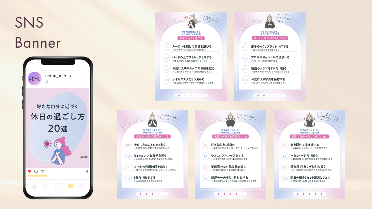 工夫したところ|ターゲットがInstagramを見たときに、ゆっくりした気持ちで読み続けてもらいたかったので、温かみのある作品にしたいと思いました。 さらにキラキラしたイメージを作りたかったのであしらいの文字にこだわり、アイコンもひし形にしました。 背景はピンクとブルーのグラデーションを対角線上に置くことで温かみのあるイメージに近づけたと思います。 またターゲットの内にあるガチガチになったものなどがあるとすれば、それを一つずつ剥がして行くことで気持ちも軽くなり、丸くなって欲しいという気持ちを「円」で表現しました。 20選だったので、順番も簡単なものを先に持ってきて、最後は夜に出来そうなものにすることで「私にもできるかも」と思ってもらえる内容にしました。