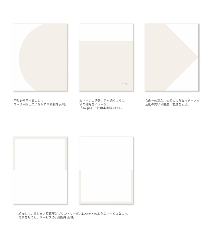 - 各ページに「swipe」の文字を配置し、ユーザーの行動喚起を促す構成にしています。