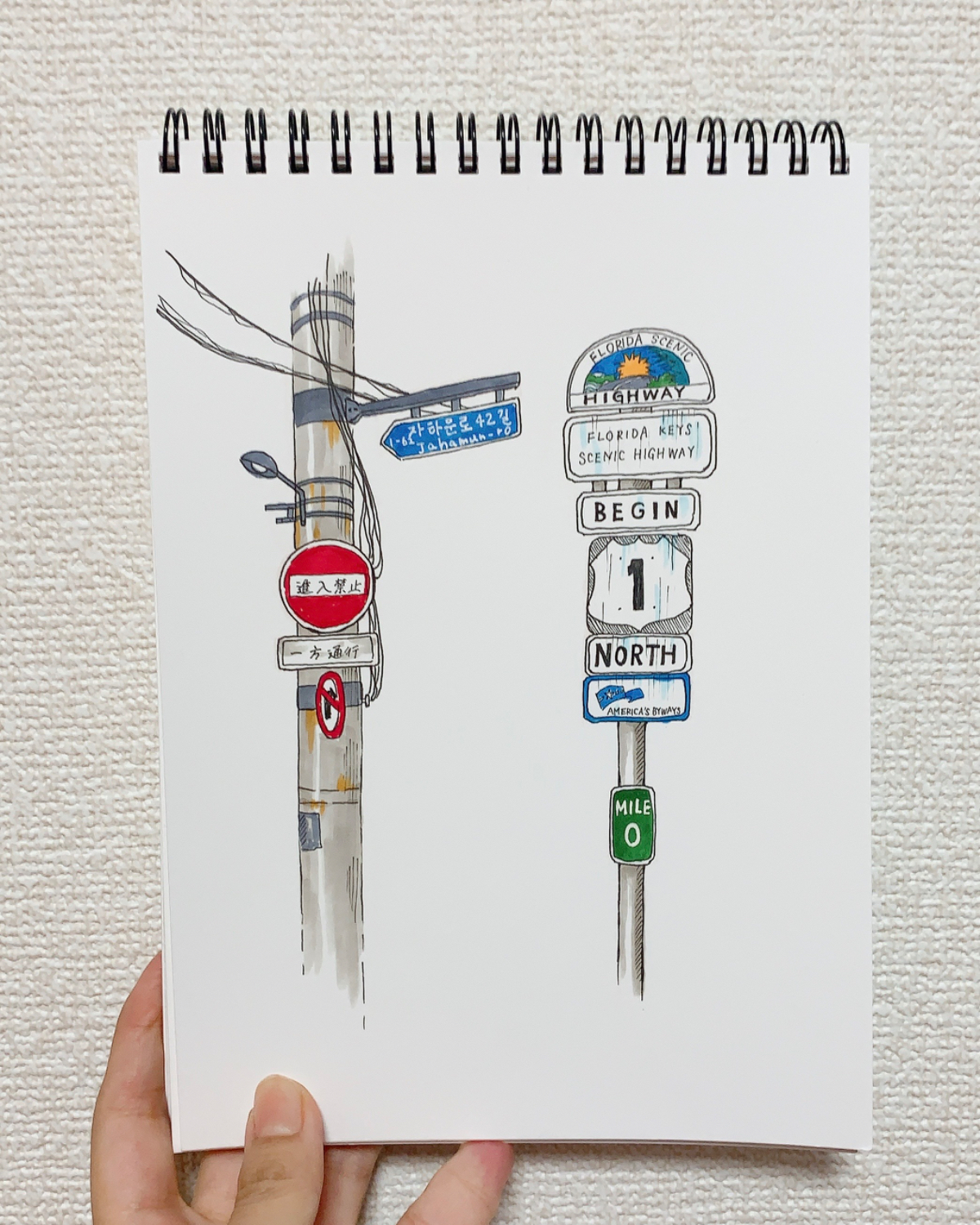 イラスト/Signs Mai Takaoka 日常に溶け込むサインや標識に注目し、その造形や配置の面白さを描き留めたスケッチです。異なる国の風景を対比させることで、街の空気感や文化の違いを表現しました。使用ツール:コピックやボールペン