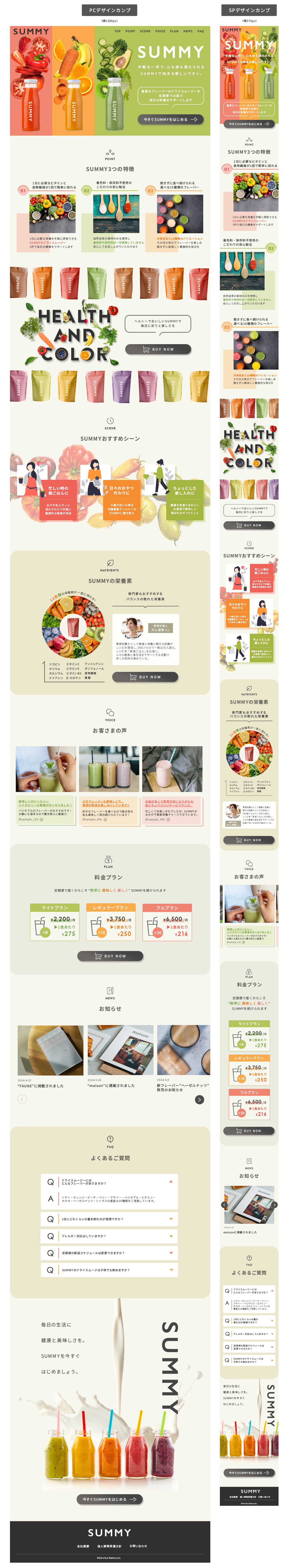 SHElikes トレーニングプログラムの課題で、架空のドライスムージーのサブスクリプションLPを制作。テーマ・指定文言を元に構成したサイトデザインと、実装(レスポンシブ対応済み)まで行いました。