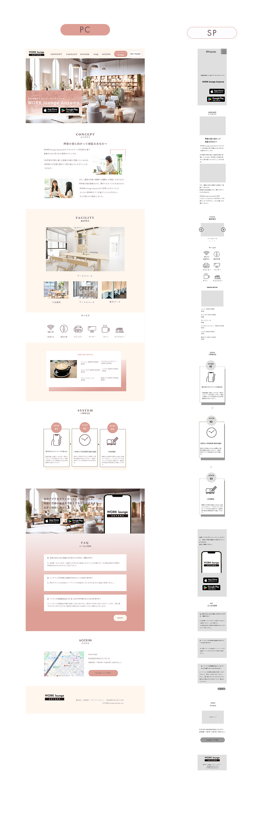 SHElikes MULTI CREATOR PROJECTにて、LP制作(架空コワーキングスペース)の課題に取組みました。※課題の指定によりPCのデザインカンプ、SPはワイヤーフレームのみ制作 制作期間:2週間 制作ツール:Photoshop