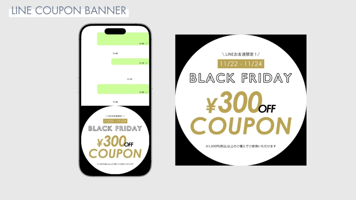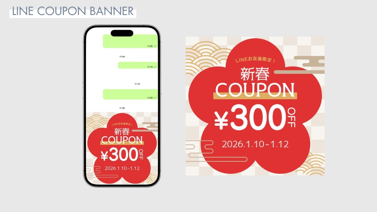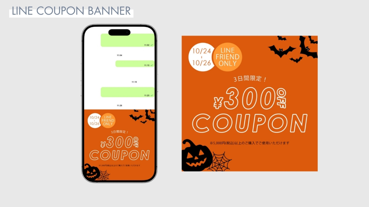 LINEクーポン用バナー Kanae Nakamura 化粧品会社ECサイト運営 OVERVIEW LINEで定期的に配信しているゲリラクーポンのバナーです。 YEAR 2025 - 2026 工夫した点・イベント感が出るように、季節の特色をあしらいで表現しました。・値引き金額が目立つように、金額の部分を1番大きく配置しました。【使用ツール】・Photoshop