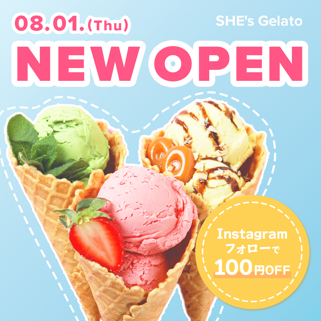 架空のアイスクリーム屋「SHE's Gelato」の新規開店を宣伝するために、Instagram広告配信用の正方形バナーを作成しました。
