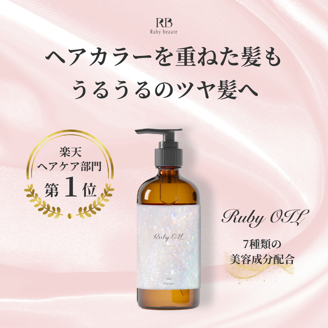 Ruby OILはヘアカラーを楽しむ方のお悩みに寄り添ったヘアオイルとして開発されました。 ヘアカラーで傷んだ髪のパサつきを、潤いのある滑らかなツヤ髪へ導きます。 保湿美容成分を7種類配合しており、傷みのケアはもちろん、カラーの色持ちも良くしてくれます。 普段の生活やリラックスタイムにも気にならない無香料。 販売場所:全国のドラッグストア、量販店、楽天 価格:150ml 3,500円