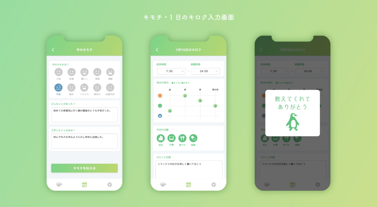 パニックになりそうな時、原因も分からずに落ち込んだ時に、考え込まずサッとメモができる手軽さを大事にしました。選んだ感情に応じて質問項目が変わります。