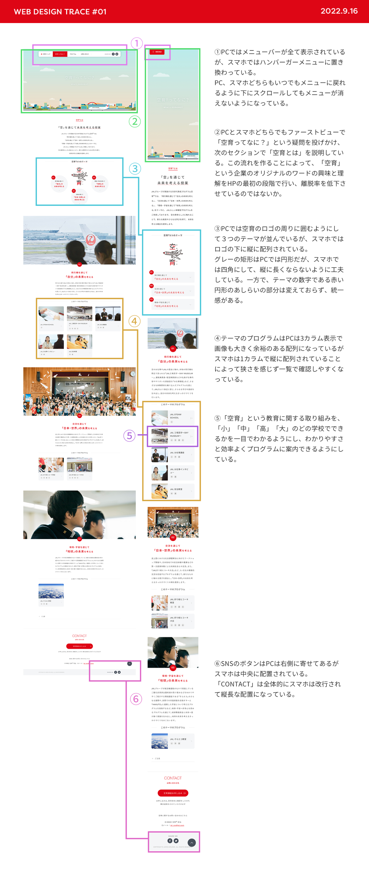 とにかく再現性にこだわりました。フォントのズレを極限までなくすことと、写真の配置など細部までこだわった。また、レスポンシブの考察はPCとスマホの違いだけでなく、WEBページのデザインそのものの工夫に着目し、WEBページにおけるメッセージの伝え方や、ユーザーストーリーなどを考察した。考察ページ自体も、カラーと数字を使用することでどの部分の考察なのかを分かりやすくした。