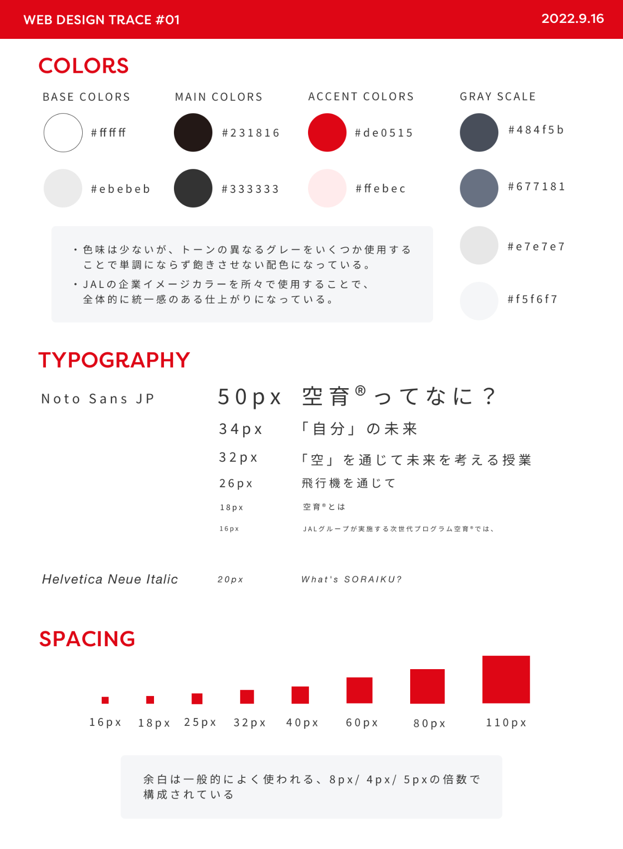 SHElikesのマルチクリエイターコースの実践課題でLPをトレースしました。トレースを通してスタイルガイドを作成し考察・分析、PC・S Pのデバイスによるレイアウトの変化を考察・分析しました。
