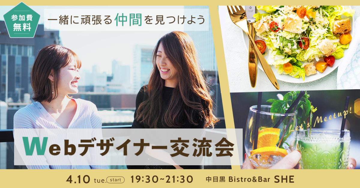 交流イベントということで、明るいイエローとアクセントのグリーンを際立たせるような配色で楽しい印象を心掛けました。料理や飲み物の画像も大きめに配置して、飲食も楽しめるイベントであることがわかるようにしています。