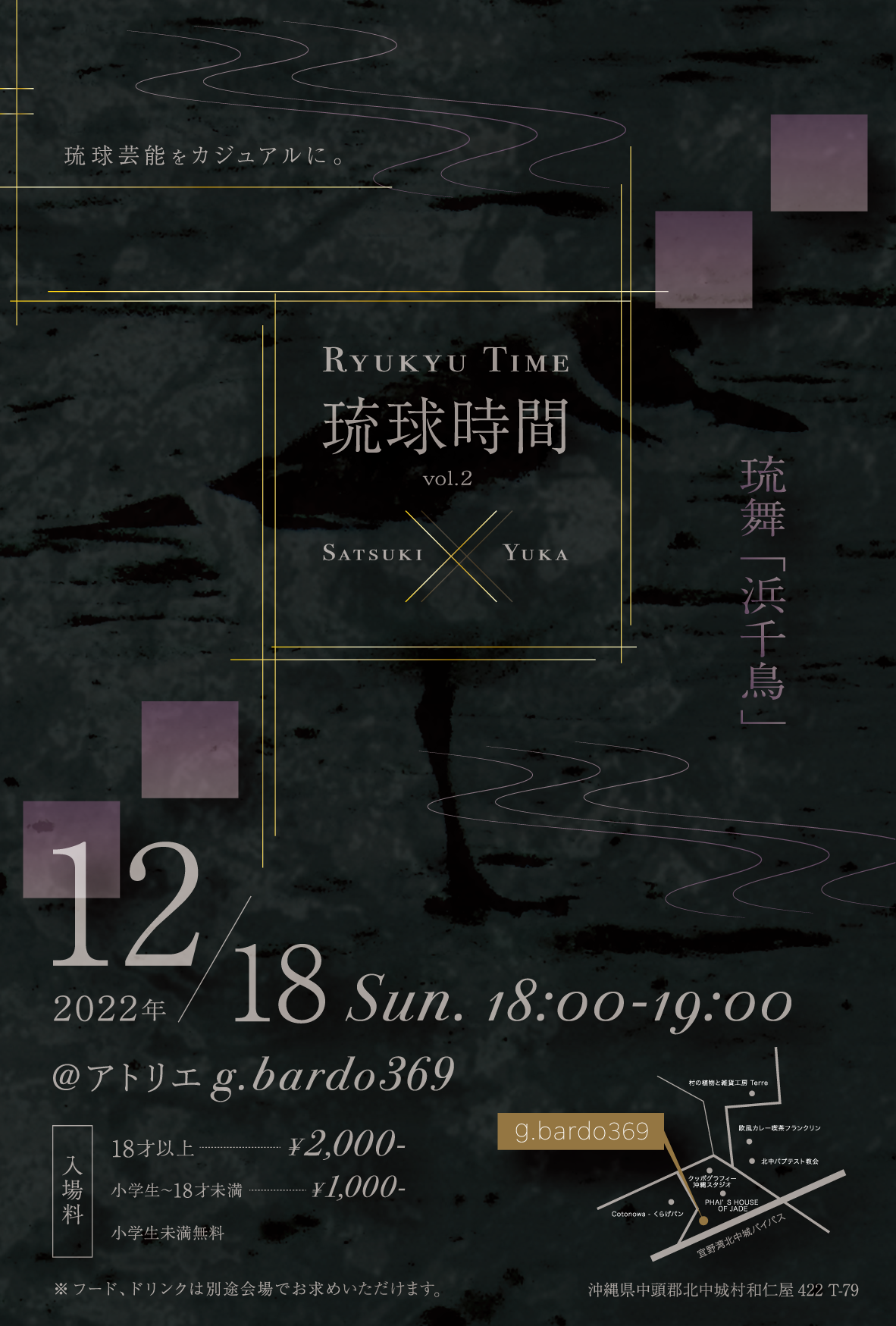 琉舞の「浜千鳥」とイベント会場「アトリエg.bardo」の雰囲気から、シックなデザインにまとめました。