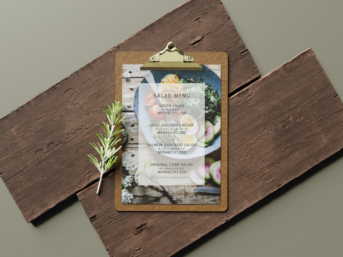 写真もテキストもどちらも目立たせるために、大胆に食事の写真を背面に敷き、その中に半透明の四角を置きテキストを配置しました。