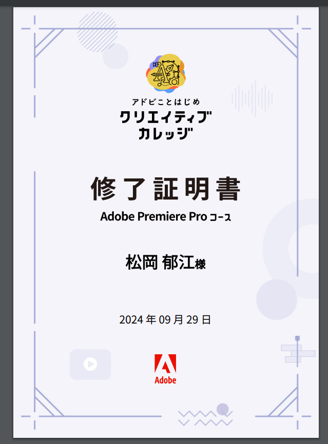 Adobeクリエイティブカレッジ PremiereProコースの受講完了の証書です。